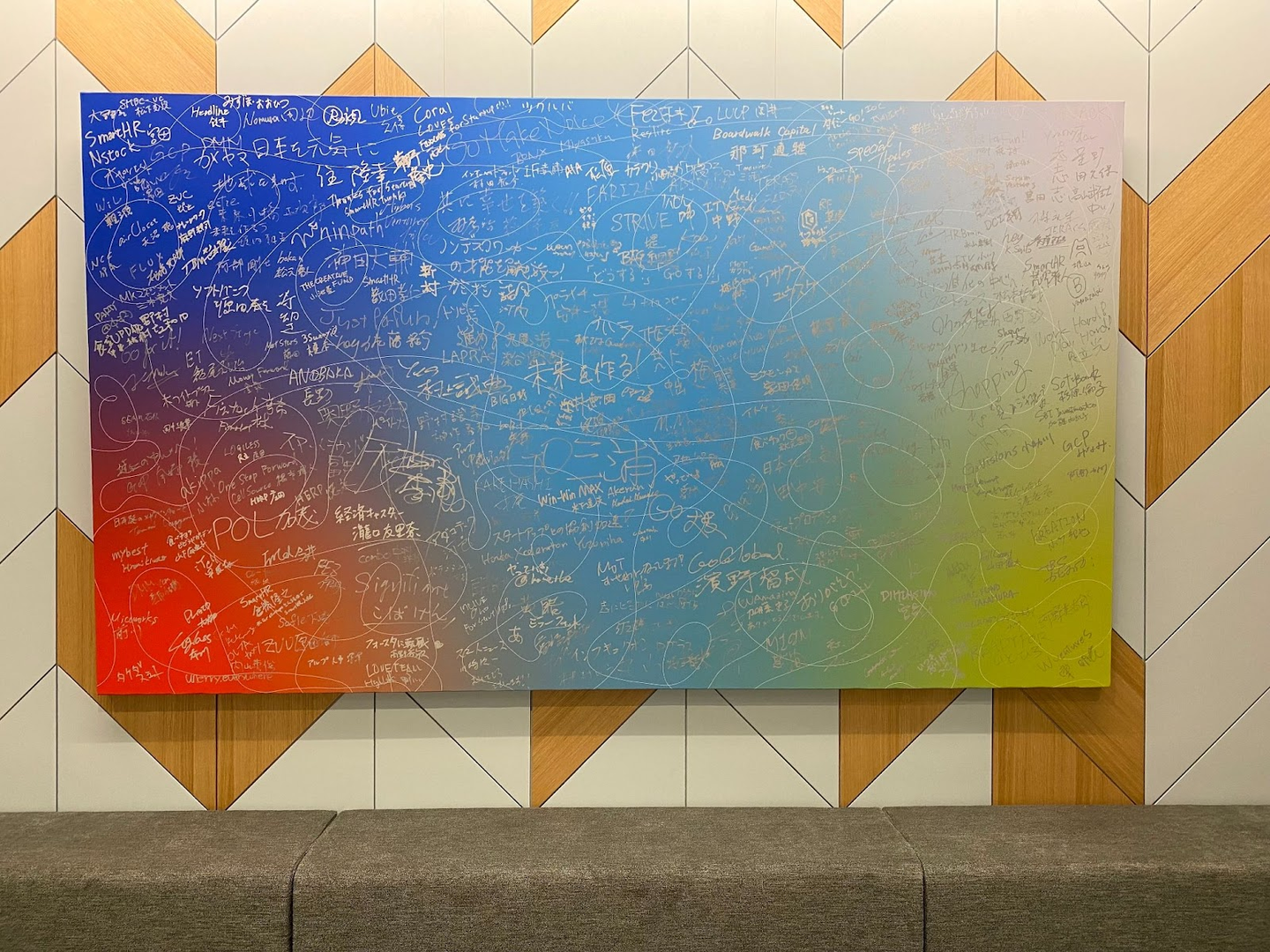 記念すべき時間を共有させていただいたゲストの方々全員に、直筆のサインを刻んでいただきました。こちらは新オフィスエントランスに飾っております。