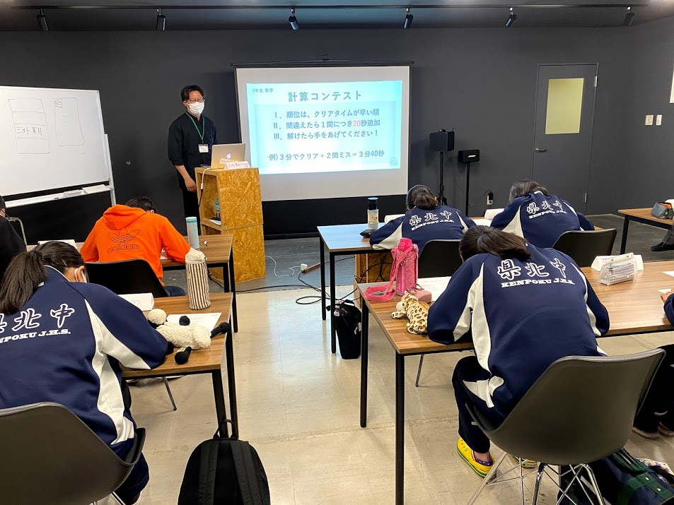 体験入塾には、日頃お世話になっている役場の方々や町長にも見学にお越しいただきました。数学の授業で行われた ”計算コンテスト” にもご参加いただき、本気で大人たちが計算問題に取り組んでいました(笑)