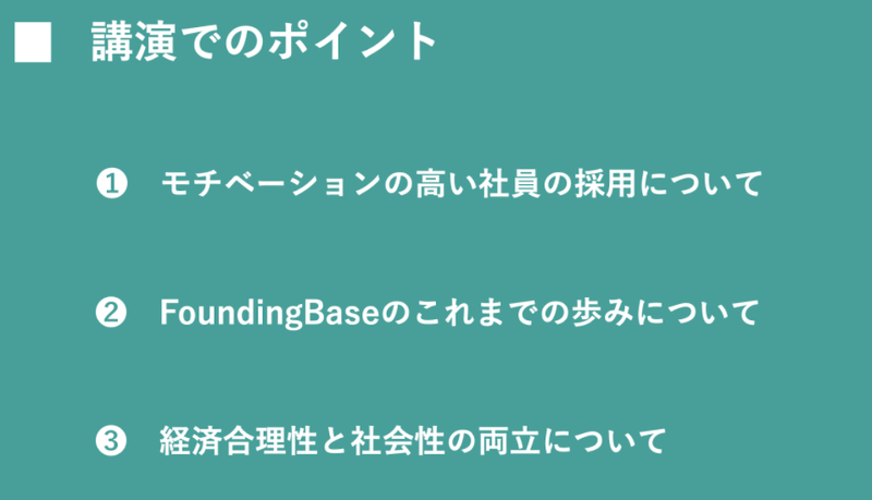 講演内では下記3つのポイントに絞り、FoundingBaseの話しも踏まえてお伝えしました。