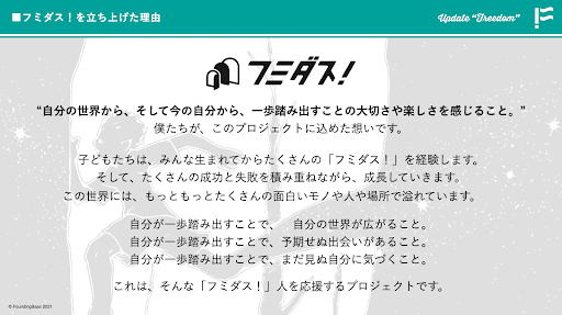 「自分が一歩踏み出すことで、自分の世界が広がること。」 「自分が一歩踏み出すことで、予期せぬ出会いがあること。」 「自分が一歩踏み出すことで、まだ見ぬ自分に気づくこと。」 これは、そんな日本の各地域の「フミダス」子どもを応援するプロジェクトです。