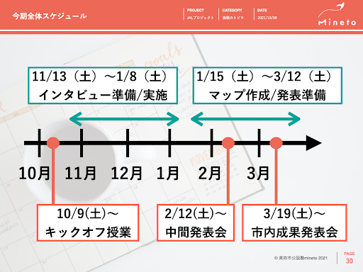このプロジェクトは、日本航空株式会社と美祢市観光協会との協働プロジェクトになっており、10/9(土)に行われたキックオフ授業では、山口支店長にもお越しいただきました。minetoの生徒たちが、実際に地域に飛び出しながらふるさとを見つめ直し、半年間かけて美祢市の新たなマップを作成していきました!