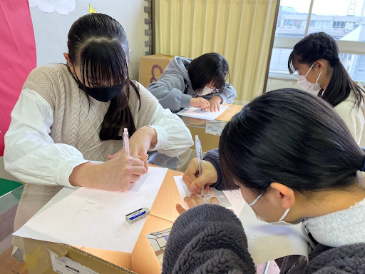 最後に、いよいよマップのデザイン制作に着手し、インタビューの情報をもとにデザインに落とし込む授業を実施しました。デザインチームと文章構成チームに分かれて作業を行いました。デザインチームは、マップに載せる素材を描き、文章構成チームは、マップの構成や文章を考えました。また、プロのデザイナーによる「人の描き方レクチャー」や大手広告代理店で経験を積んだマーケターによる「プロモーションについて」の特別授業も実施しました!