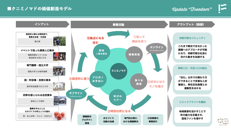 福島県国見町では、関係人口×農業の文脈で事業を行ってきました。福島県の国見町では主に桃などのフルーツが有名です。国見町では「クニミノマド」と呼ばれる関係人口づくりに寄与する事業を行っており、地域の人と都市部の人が交流しながら、国見町の良さを体験するプログラムを提供してきました。