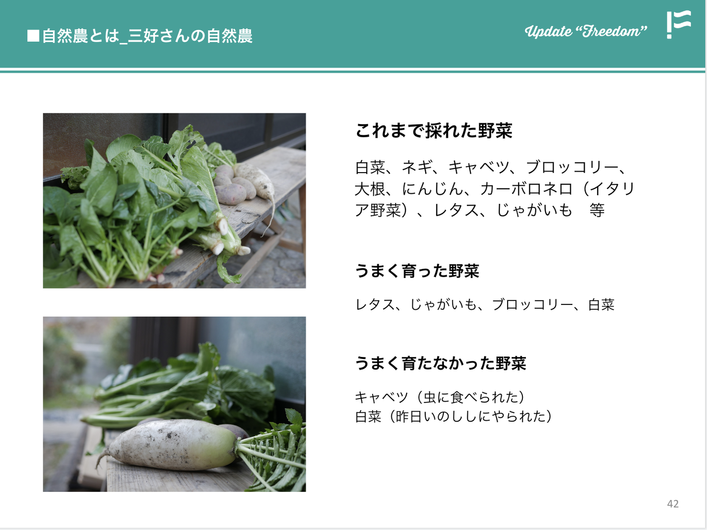 一般的な農法の説明と三好さんが実際に実践された方法やその結果、自給自足生活に挑戦する中での楽しさや苦労、リアルな生活コストを紹介させていただきました。
