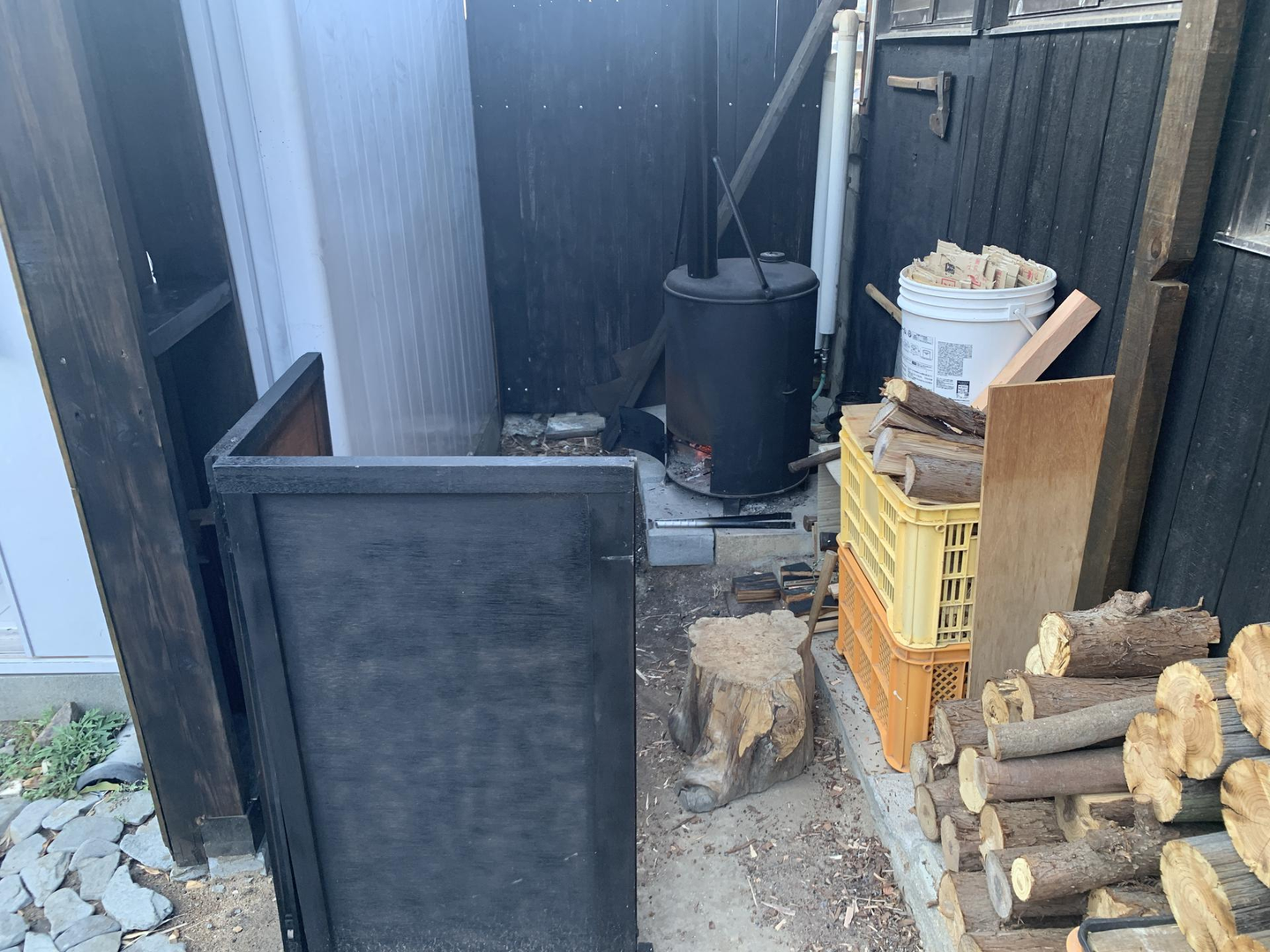 三好さんの薪ボイラーはなんと手作り!灯油タンクをDIYして作られました!市販のものに比べると火力が弱いので毎日2〜3時間薪を焚べているそうです。なので、ちょっと寒いですが、三好さんは薪を焚べながら、私達は手作りの椅子に座らせてもらい、いつも外でお話をさせていただいていました。