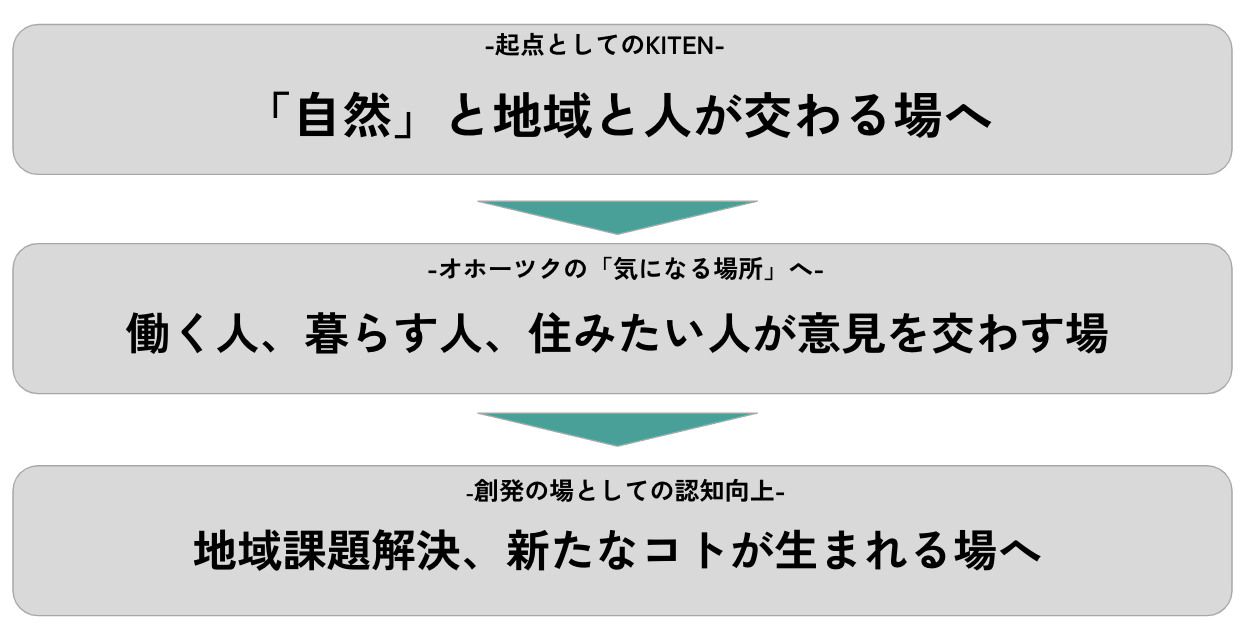 oundingBaseの関係人口事業に位置する「WorkingSpace KITEN」が目指す未来は、北海道外やオホーツク圏、町内外の異なる背景を持つ人々が「自然」と集まることで、個人(企業・行政)だけでは解決出来ない地域課題や「お困りごと」の解決、新たなコト(contents)が生まれる場となることです!