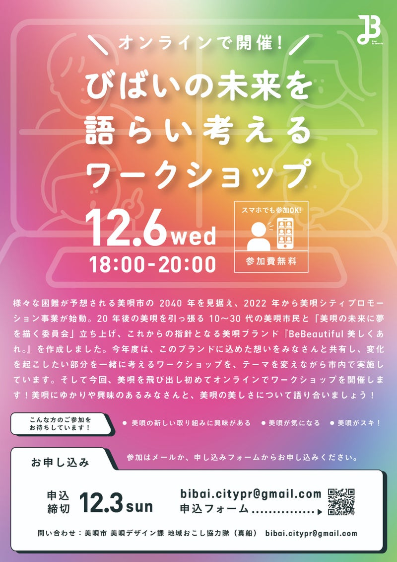 ーーーーーーーーーー 日 時:12月6日(水)18:00~20:00 会 場:オンライン開催(前々日までに登録されたメールアドレスに参加URLをご案内いたします) 人 数:先着20名 対 象:美唄のまちづくりが今より一歩でも前に進むといいなと思ってる人 参加費:無料 締 切:12月3日(日) 申 込:申込みフォームか問い合わせメール(bibai.citypr@gmail.com)からお申し込みください。 申込みフォーム: https://forms.gle/RoDvrZWdzjwwMvut6