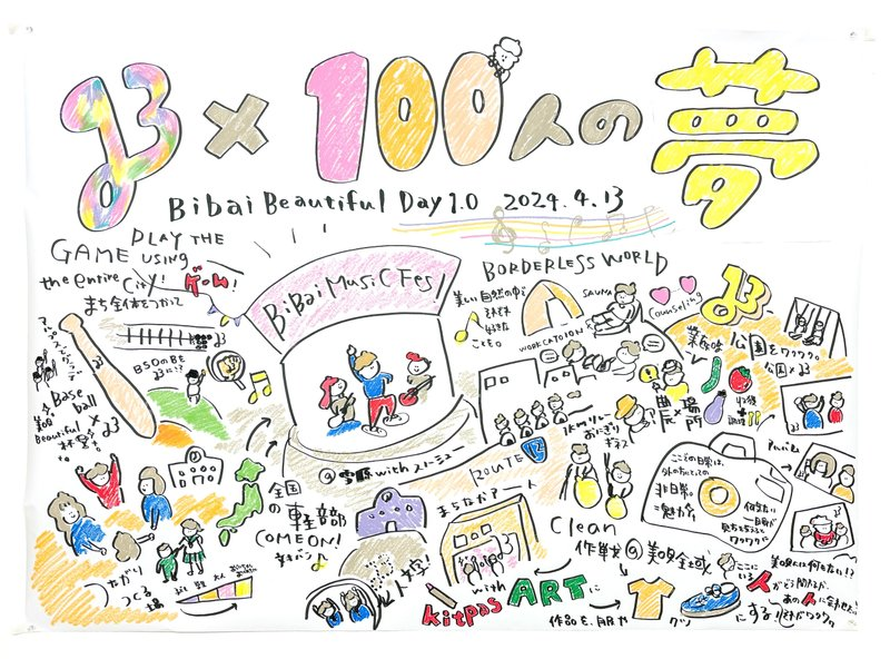 約40名の方にご参加いただき、Bを使った1人の夢、100人の夢という2つのパートに分かれてグループワークを進行。参加者から出た意見は、美唄チームの河口がグラフィックレコーディングをし、一つの画にまとめました。これは美唄コミュニティスペースに掲示して、どなたでも見ることができるようになっています。