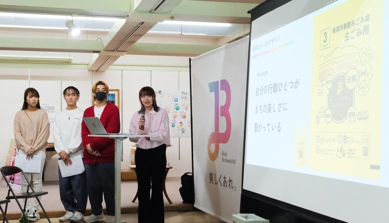 その第一歩として、10〜30代の市民11人が集まり「美唄の未来に夢を描く委員会」が立ち上がりました。1年にわたる議論を通して、美唄の軸となる魅力の言語化を進め、今後の指針となるシンボル「Be Beautiful 美しくあれ。」を制作。美しさとは、風土や文化に根ざし協働して逆境に立ち向かう精神を表しています。
