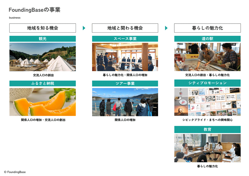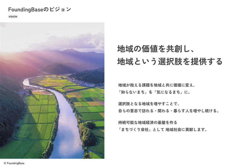そのために、中間ゴールとして掲げているのが「地域の価値を共創し、地域という選択肢を提供する」というVISIONです。選択肢がなければ、自らの意志で選択することはできません。様々な課題を抱えるがゆえ、価値を発揮しきれず、選択肢になりづらい地域が数多くあると思います。FoundingBaseが主体者となって、地域とともに課題を価値に変え、「行ってみる」「関わってみる」「暮らしてみる」という選択肢をより多くの人に提供したいと考えています。