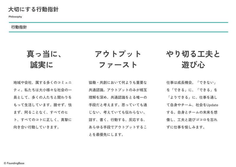 アウトプットファースト:協働・共創するためには、アウトプットを通じて共通認識をつくり、相互理解を深めていくことが必須。思っていることや考えていることを、まず自分からアウトプットすること。