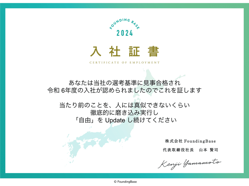 キックオフにて新入社員に授与された入社証書