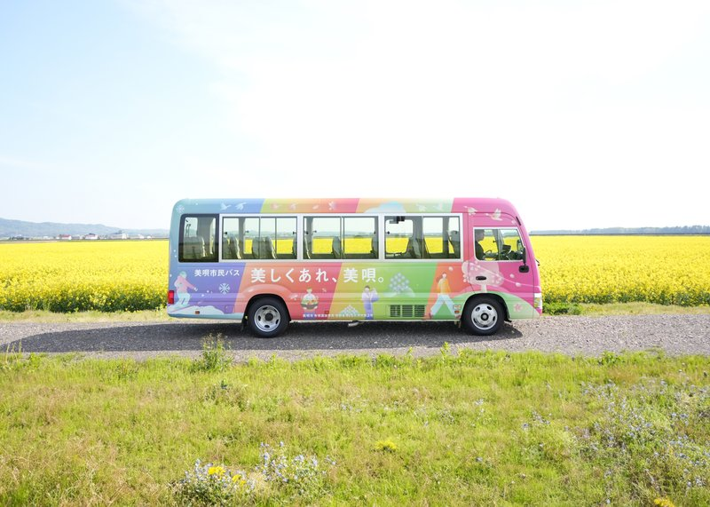 5月23日(木)より、美唄ブランド「Be Beautiful」のグラデーションカラーをベースにした新たな美唄市民バスの運行が始まりました。今回のバスラッピングは、美唄シティプロモーション事業で実施したワークショップで市民から寄せられた意見をもとに実現したものです。親しみやすいイラストで美唄の豊かな四季を表現し、美唄市民の方だけでなく、市外の方にもバスを見た際にまちの魅力を一目で感じられるデザインが完成しました。
