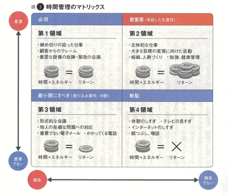 第四領域に入るのは緊急でもなく重要でもない項目で気分転換の娯楽がこれに当たる。適度な息抜きは良いが生産性のある活動が全くないため、大切な時間とエネルギーを費やしてもリターンはない。 一方、右上の第二領域は「卓越した生産性」の領域である。ここで得られるリターンは常に費やした時間とエネルギーを上回る。そして、第二領域に注力すれば、第一領域の緊急度が高く、かつ重要な活動を減らすこともできる。クレーム処理が早い会社Aがあり月間100件のクレーム処理をしているのと、A社ほどクレーム処理が早くないが月間で1件しかクレームが発生しない会社Bがありどちらが生産性が高いのかは一目瞭然である。