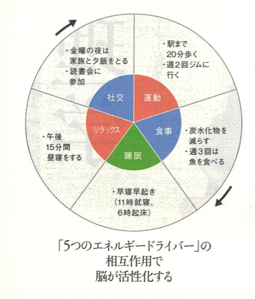 心身にエネルギーを充電するポイントは5つある。これを「5つのエネルギードライバー」と呼んでおり、ドライバーの相互作用によって脳は活性化し、燃え続けることが可能になる。