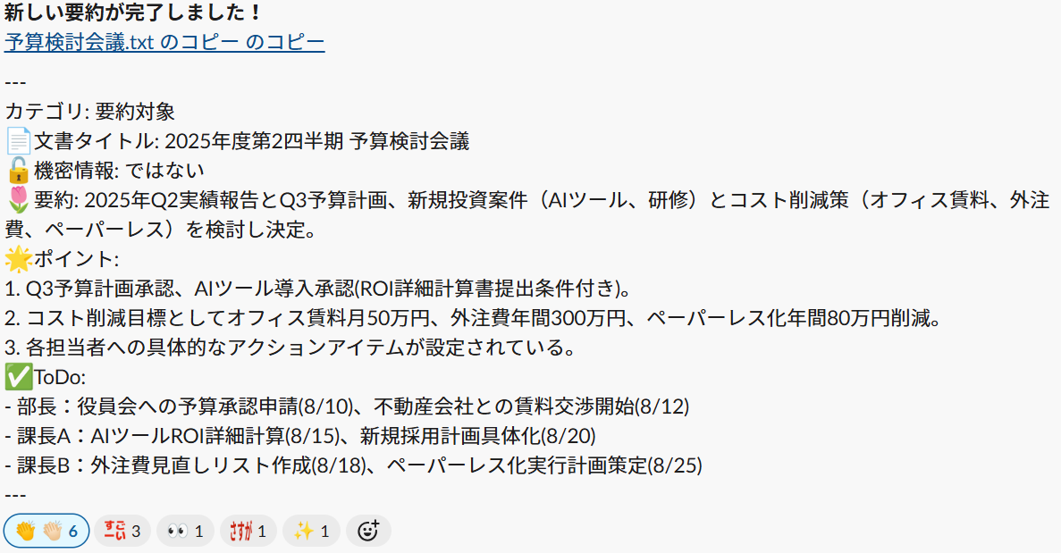 下記は、参加メンバーが作成したbotが実際に出力した議事録サマリーです。