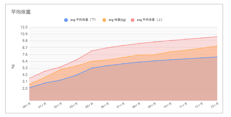 身長・体重・頭位など、日別と月別の成長グラフ作成して、そこに全国平均も組み合わせて、自分の子どもがどれくらいの位置なのかわかりやすいように。