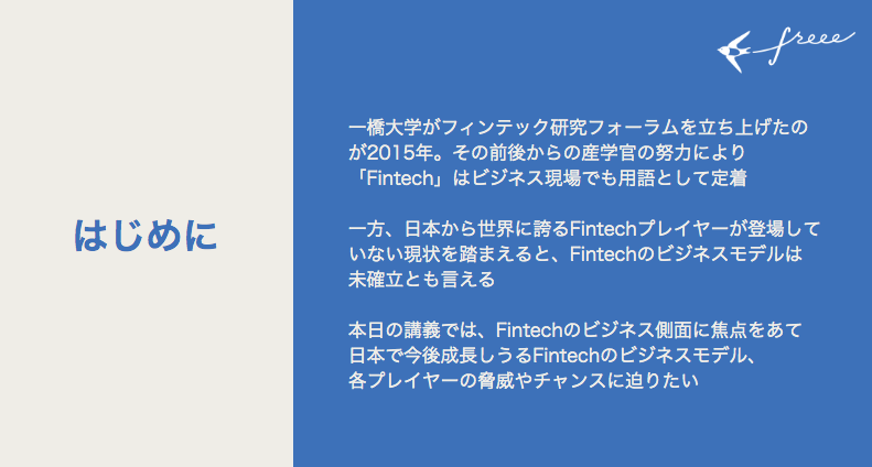 スライドはこのように始まり、金融ビジネスやFintechの説明が始まりました。