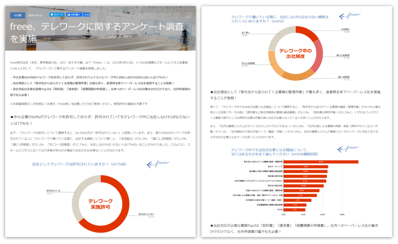 例えば、4月の緊急事態宣言下で行った「テレワーク実態調査」があります。テレワークの実態と課題を把握しfreeeの訴求につなげるために行った調査ですが、調査結果が日本経済新聞の社説や朝日新聞、フジテレビなど多くのメディアで活用されました。これも、PRチームと深く連携しているPMMだからこそ、単なる市場調査に留まらず、世に問題提起をし解決を促すという社会的なインパクトを与えることができたのだと思っています。