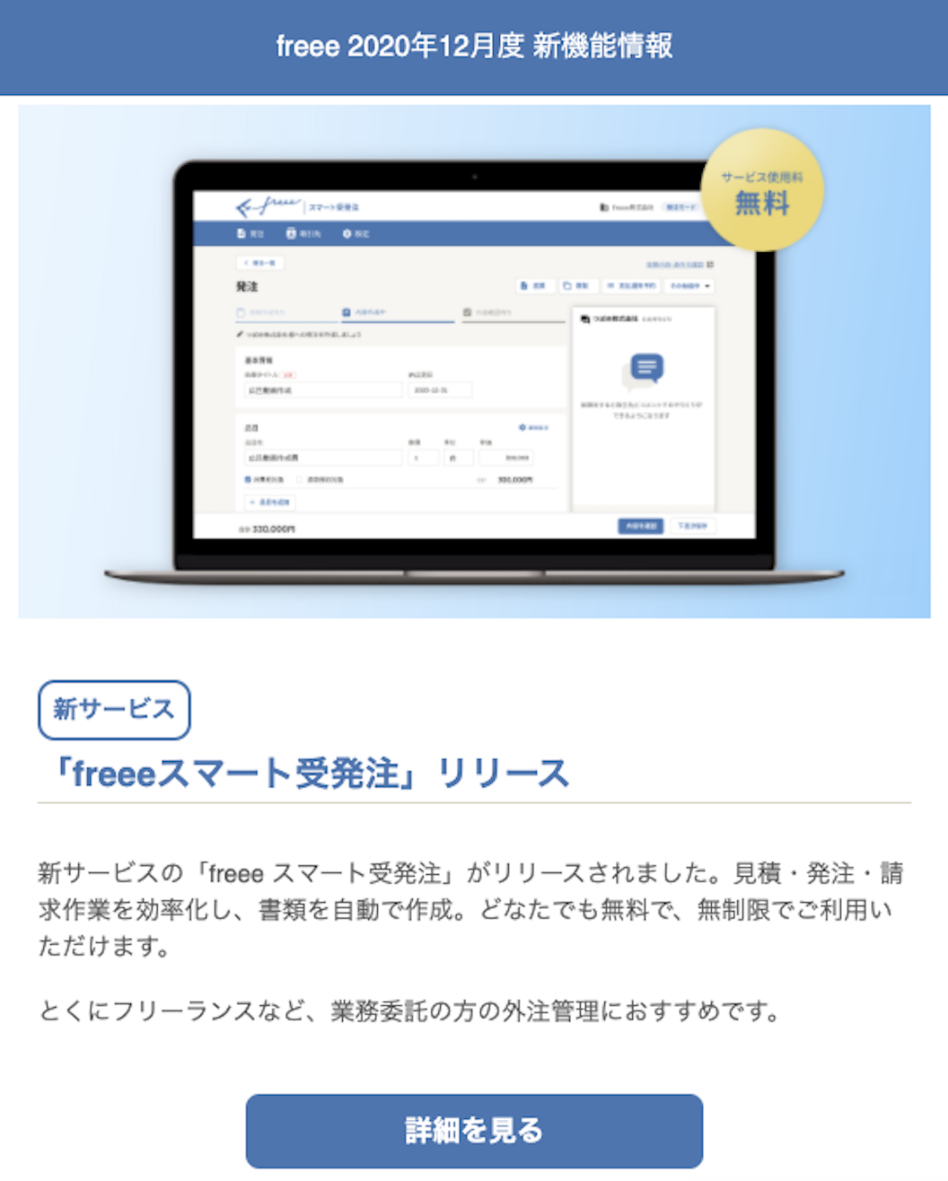 また、利用率向上という役割においては、年間およそ300にのぼるfreeeのリリース情報をタイムリーにユーザーに届けるための取りまとめを担当しています。加えて、会計freeeを基礎から学べるオンライン講座を定期的に開催しています。freeeとして届けたい、まだ届けられていない価値をきっちりと社内メンバー、そしてユーザーに伝えるというのが業務内容です。プロダクトアップデートメール(下図)を毎月法人ユーザーを中心にお送りしています。