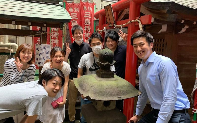 (freeeメンバーと会社近くの神社へ参拝。左から三番目が山本。)