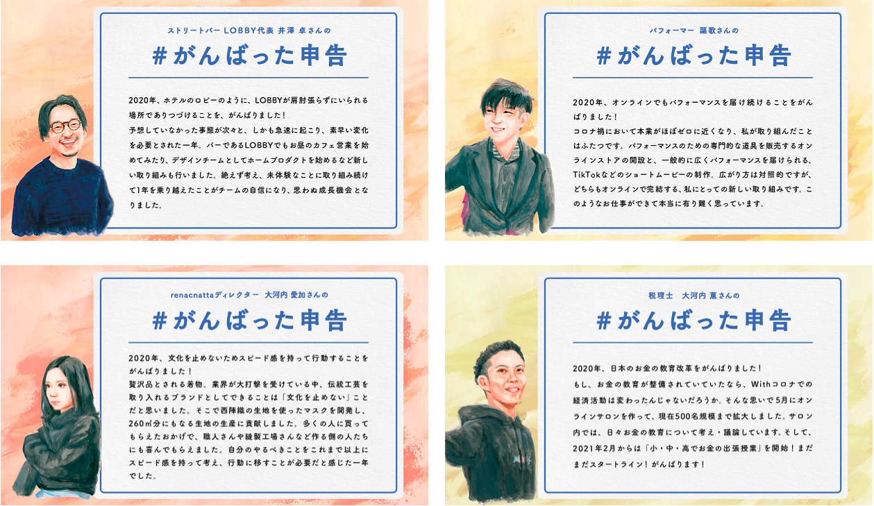 また、コロナ禍でご自身の事業を工夫しながらがんばってこられた事業主の方々にもご賛同いただき、本キャンペーンを一緒に盛り上げていただきました。