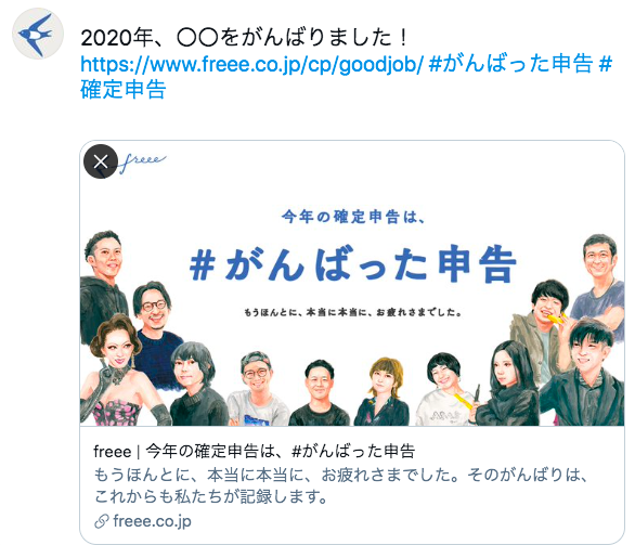 Twitterに『#がんばった申告』とのタグをつけて、2020年にどんなことを頑張ったかツイートしていただき、その中から抽選で5名様に、会計freeeプレミアムプランを1年間無料にするキャンペーン。