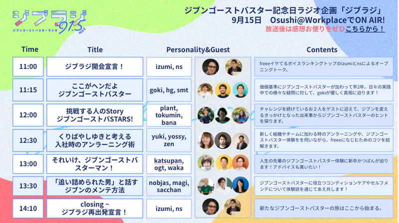 そこで今年のジブンゴーストバスターの記念日(9/15) では、もっと気軽に自然体でジブンを振り返る機会として、音声メディア、社内SNSでのネットラジオを用いてみました。