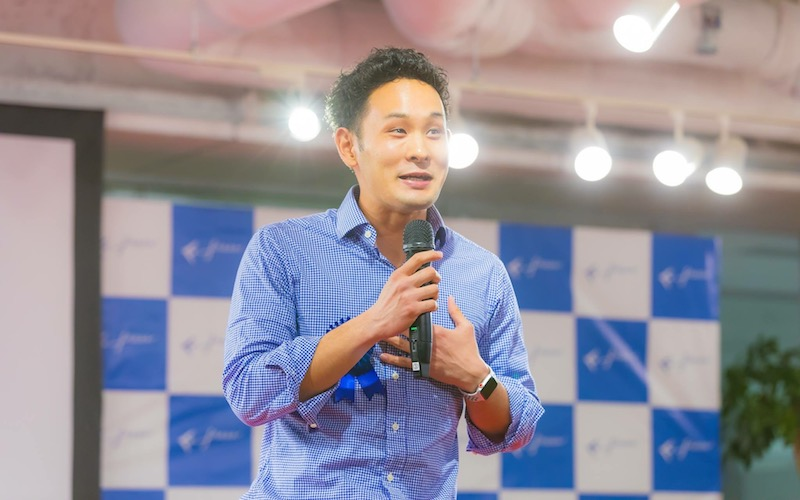 【インターン時代、社内で表彰されスピーチをする坂本】