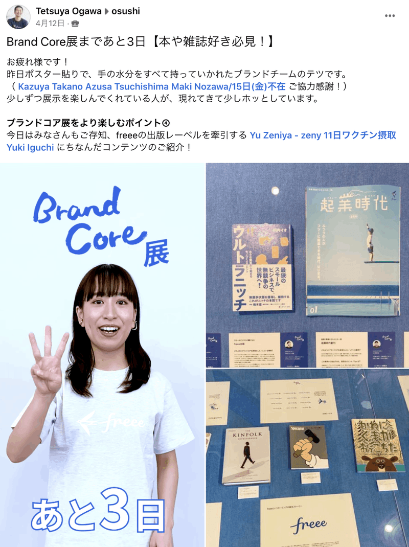 開催期間中の数カ月の間も「何かやってるぞ」感を出して、盛り上げることができたらと思い、週に2-3回ほどworkplaceを更新しました。数多くのfreeersに協力をいただき、日替わりで様々なfreeersにBrand Core展に関するトピックを投稿。