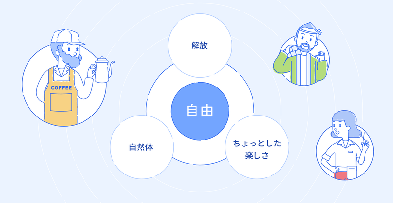 freeeは「スモールビジネスを、世界の主役に。」を全社的なミッションとして掲げています。「解放」「自然体」「ちょっとした楽しさ」この3つの要素を、freeeユーザーに感じてもらうことで、スモールビジネスに関わるすべての人に「自由」になってほしいという思いが込められています。