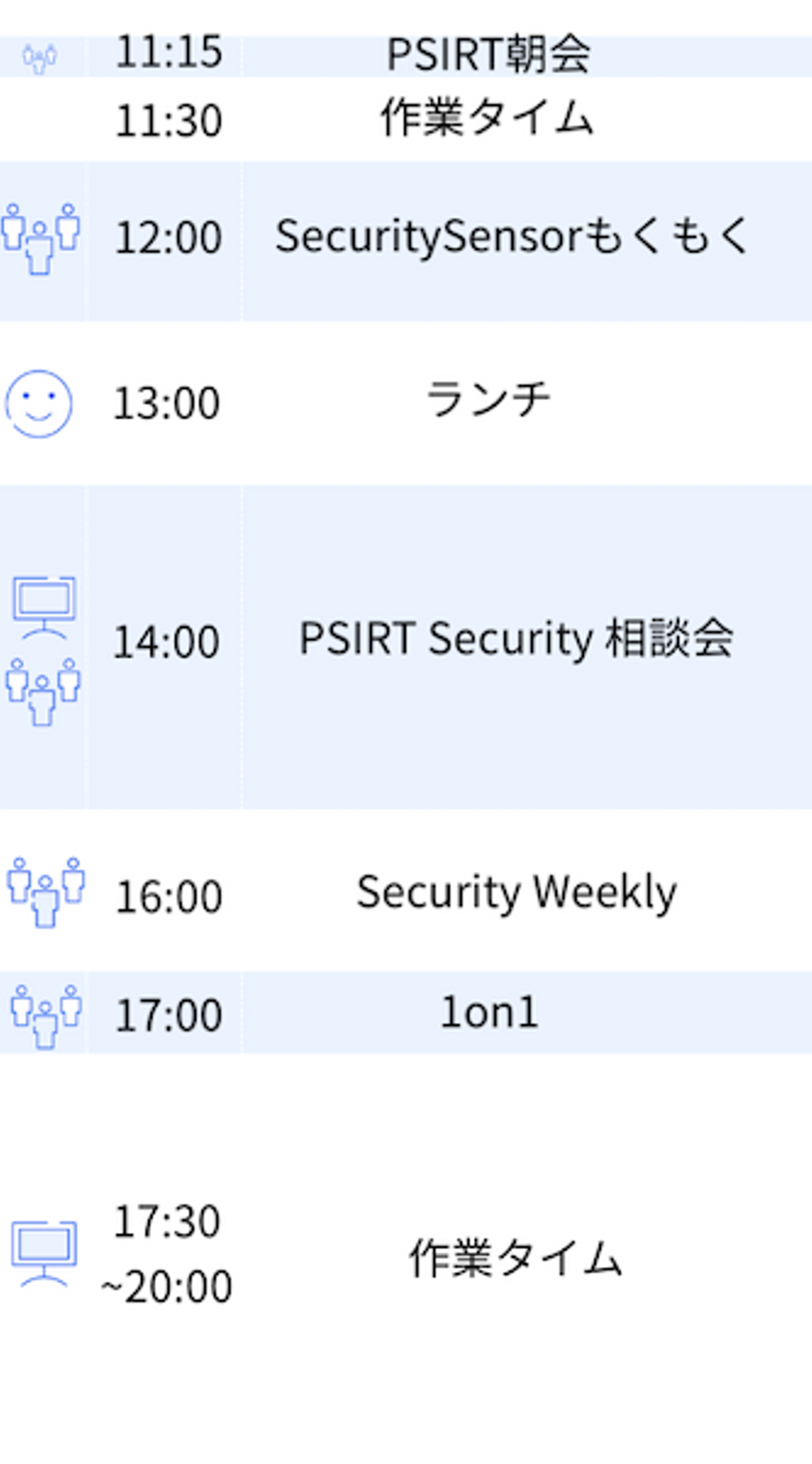 午後に入って、『PSIRT security相談会』は他の開発チームからセキュリティの相談がある場合に予定を入れてもらう時間です。何もなければ引き続き、作業や資料作りの時間となります。