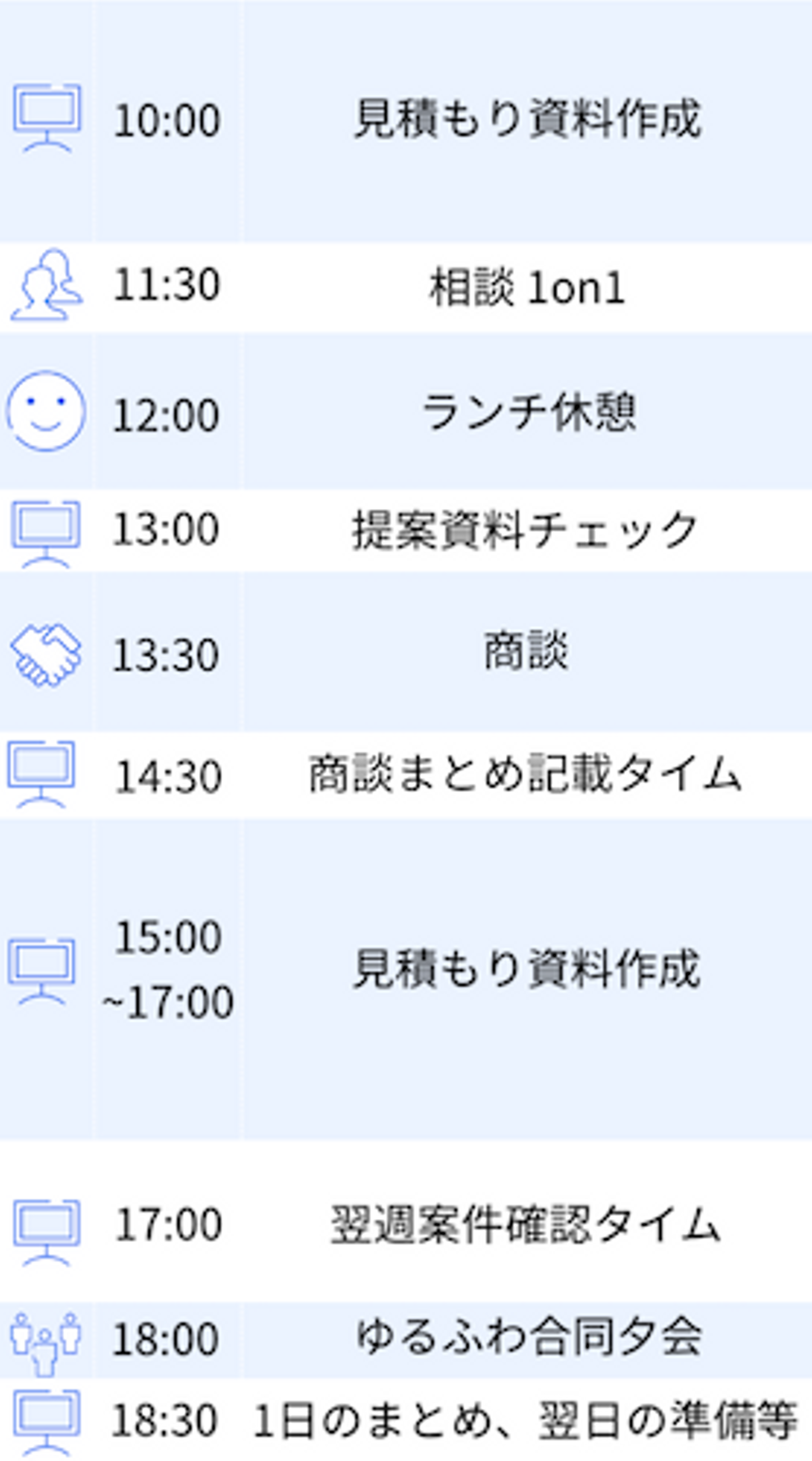 この日は契約が決まったお客さんとの導入前の最終調整が多めでした。そのため、10時〜、15時〜と契約内容の確認や見積の資料作成の時間を多く取りました。