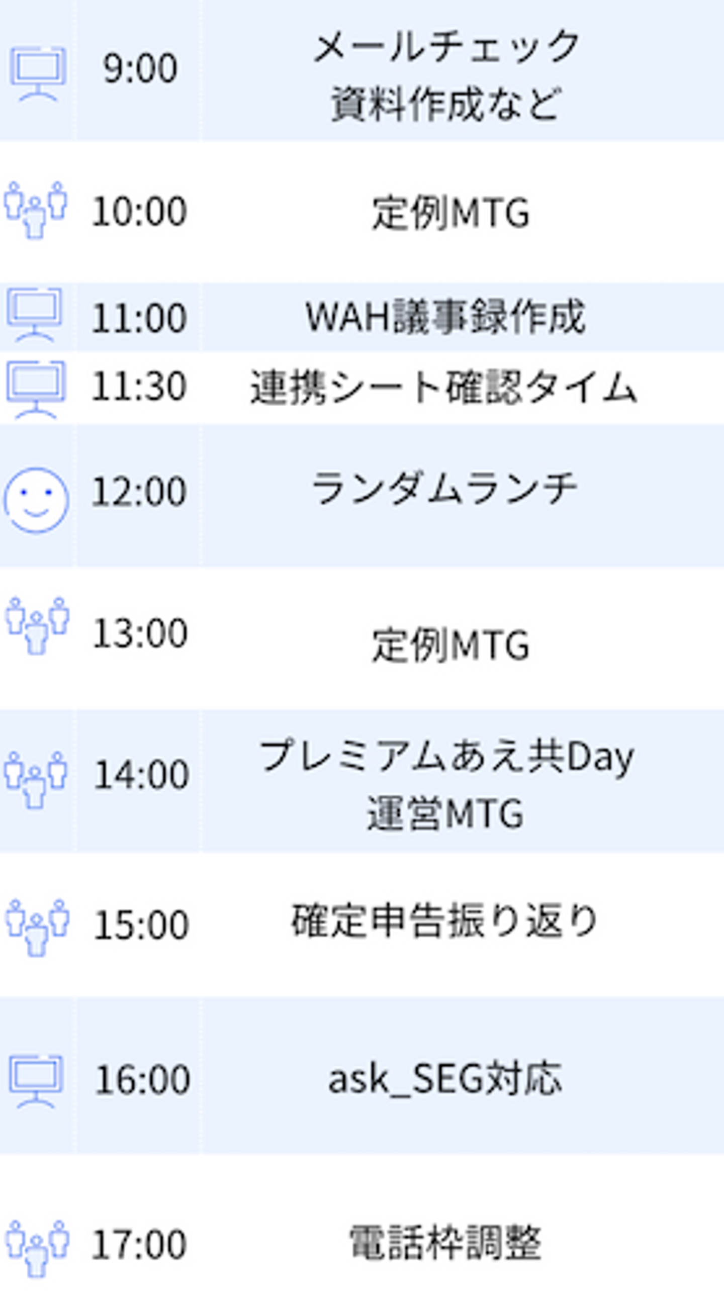11時からの『WAH議事録作成』と言うのは、前日に行われた全社会議(WAH = Weekly Aekyo Hour)の議事録をまとめ、全社コミュニケーションツールで共有しています。内容を理解したうえでわかりやすく伝える必要があるため、内容について理解を含めることができます。