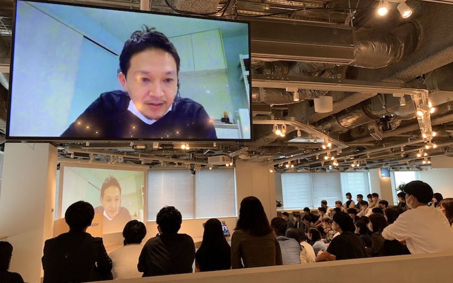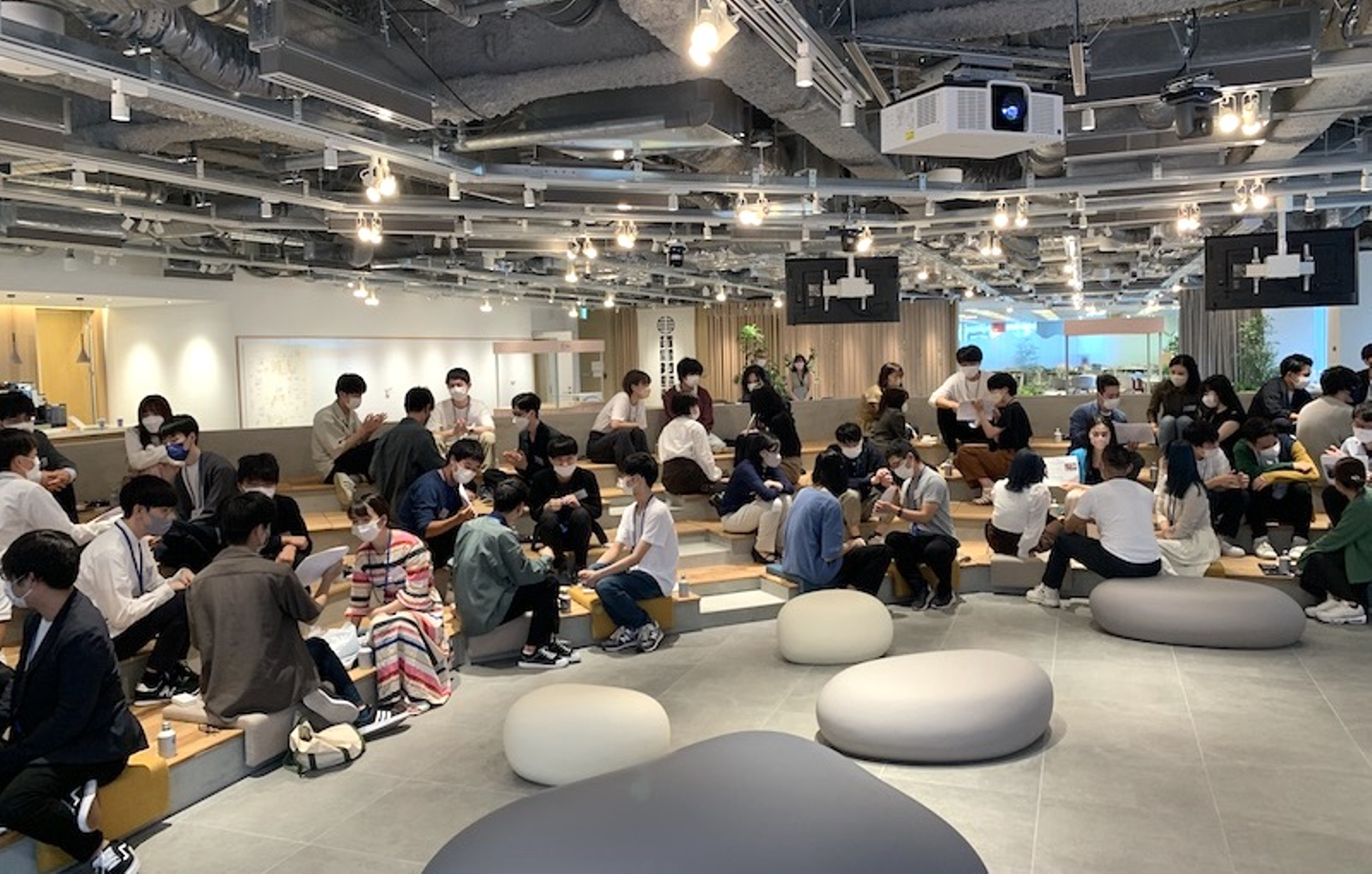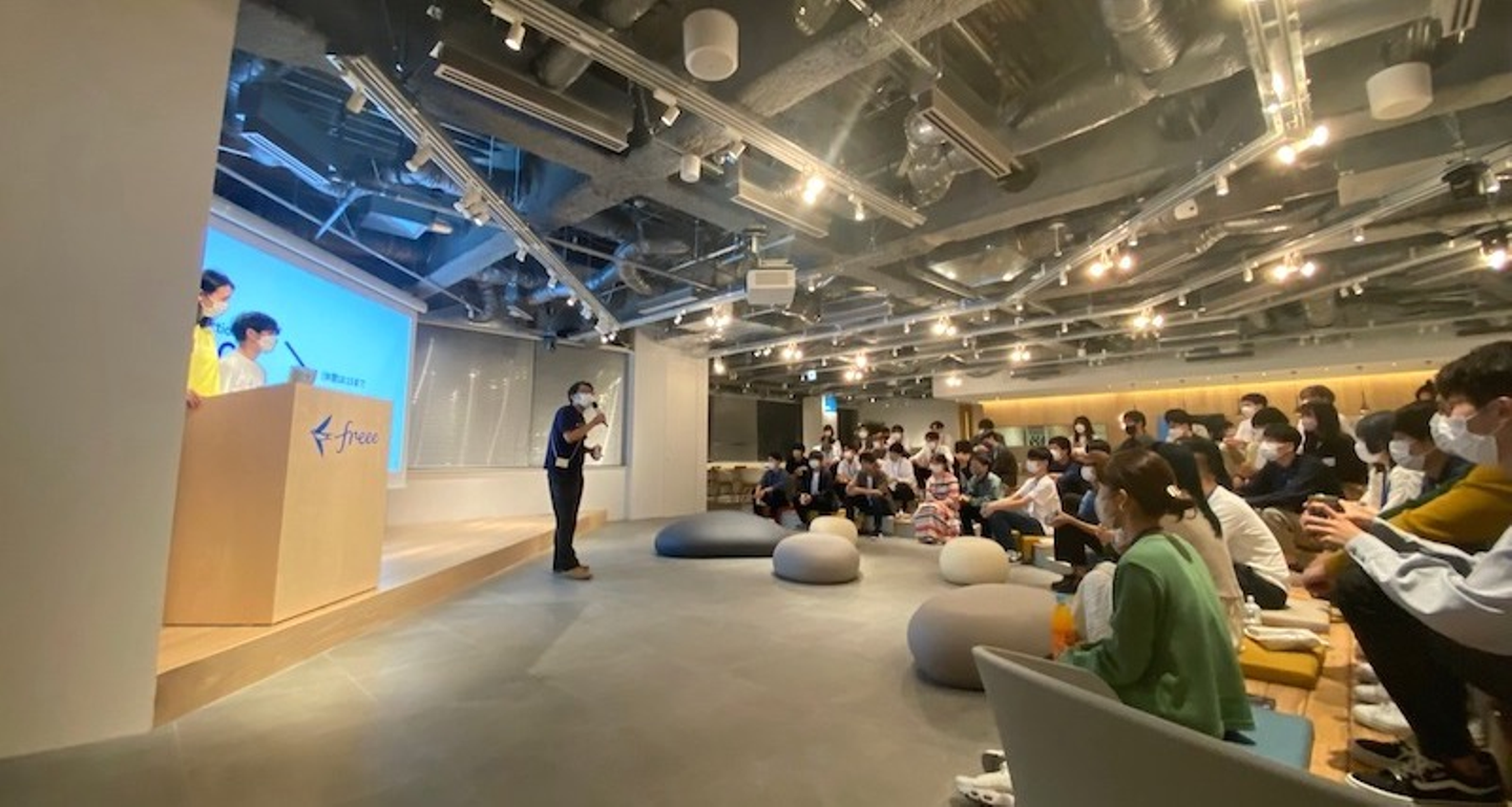 開始時刻になると、freee19階asobibaには内定者たちが集合しました!(一部、留学中のメンバーはオンラインで参加)