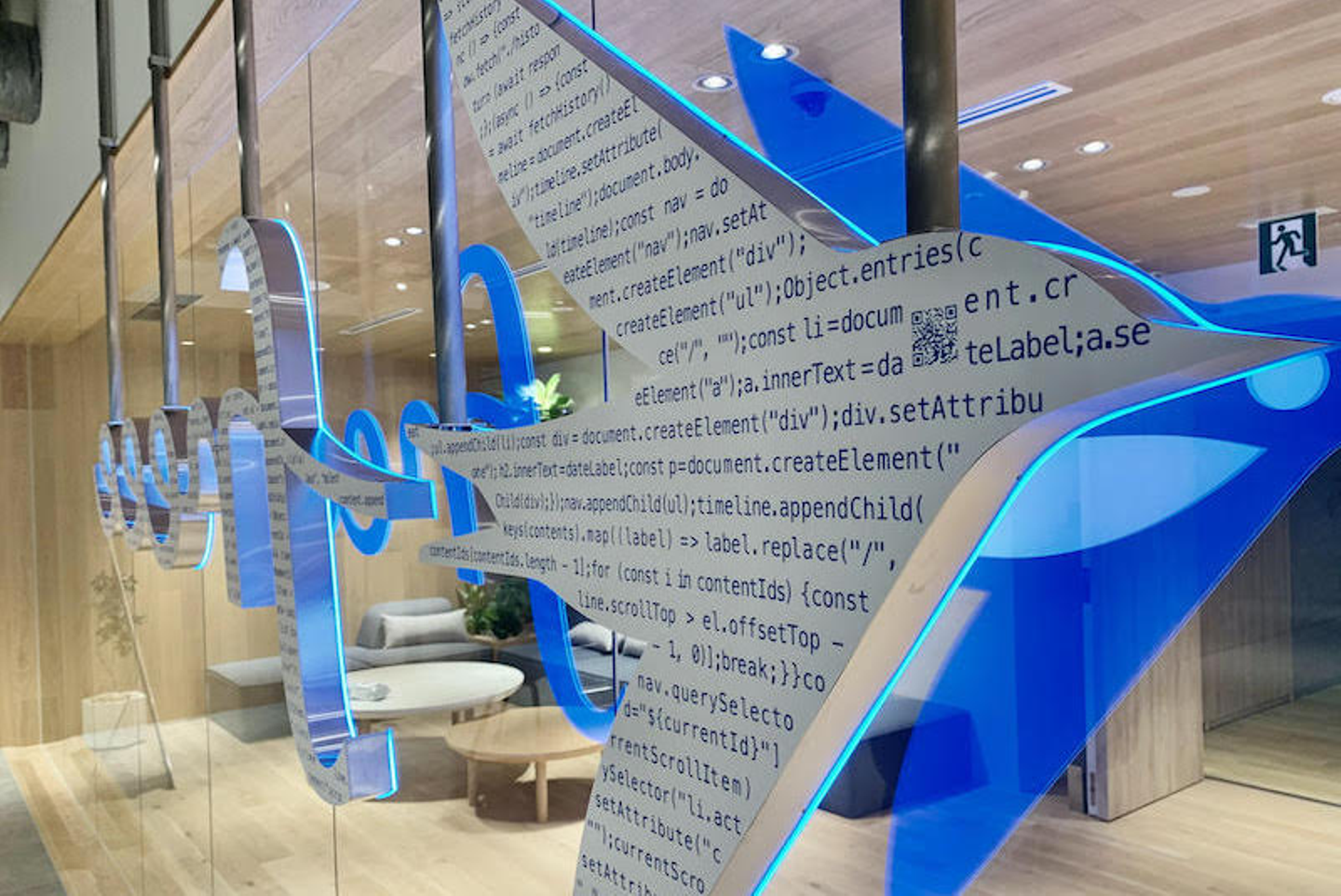 (エントランスにある大きなfreeeロゴの裏を見る内定者freeers。実は裏には、freeeの裏側というコンセプトで、freeeのエンジニアリングの歴史を年表形式で参照できるサイトのコードが印字されている)