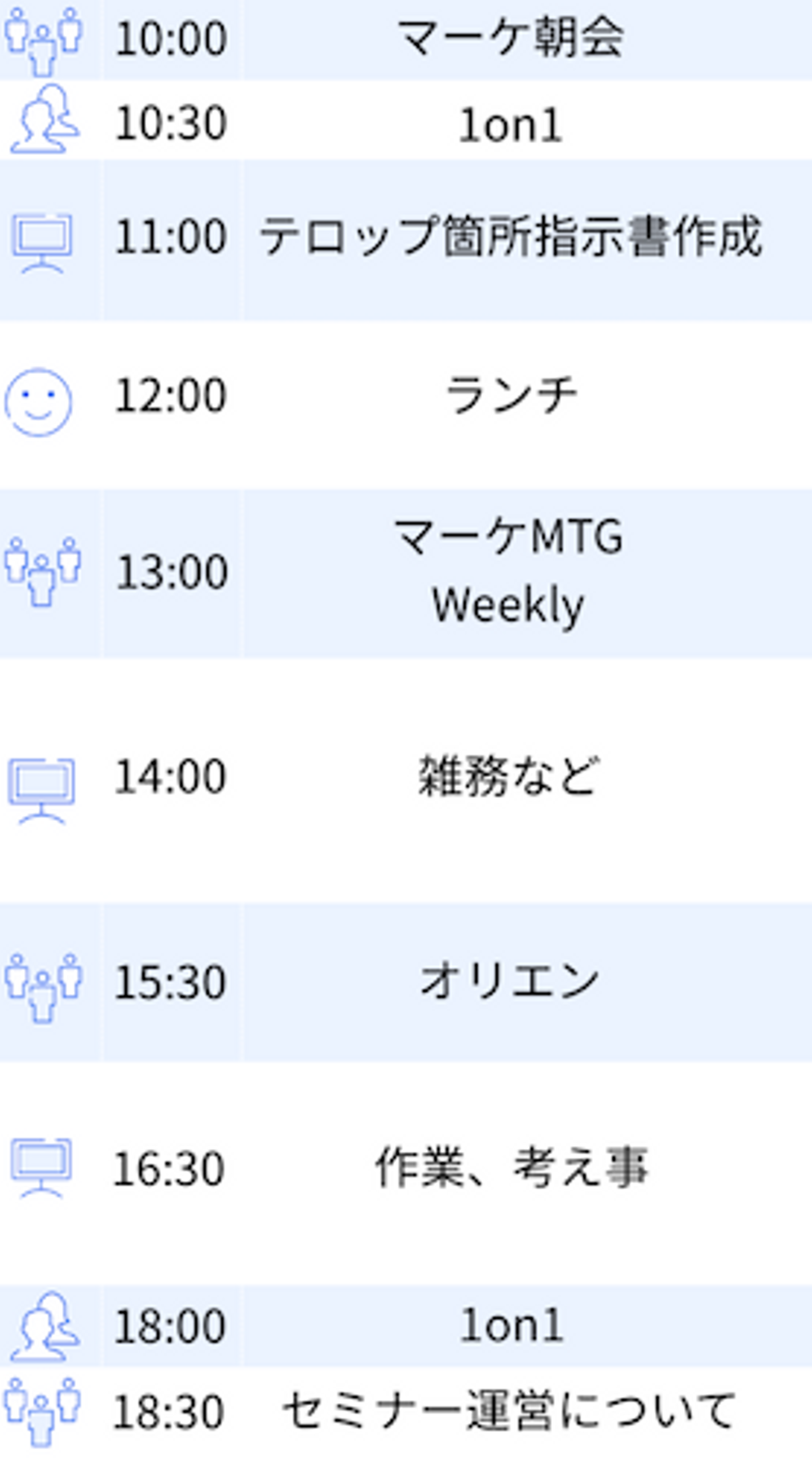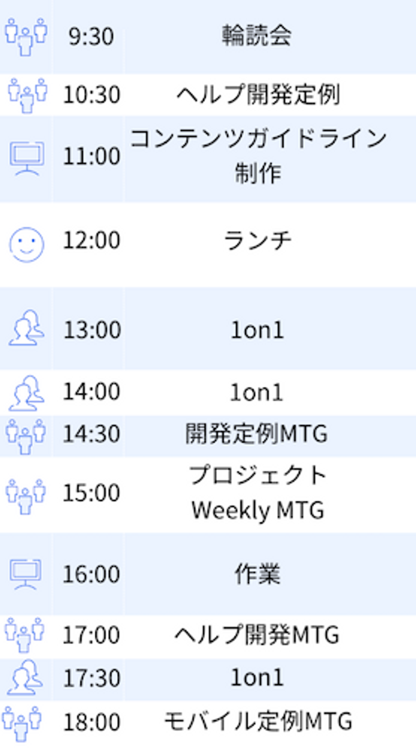 13:00、14:00、17:30には『1on1』を行いました。チームメンバーとの1on1は基本的に週次で設定しています。それぞれのメンバーがチャレンジングな仕事に挑戦しているからこそ、振り返りや悩み相談の機会を設けることで、さらに成長できるような環境を提供することを意識しています。特に話題がない時は雑談したりもします。