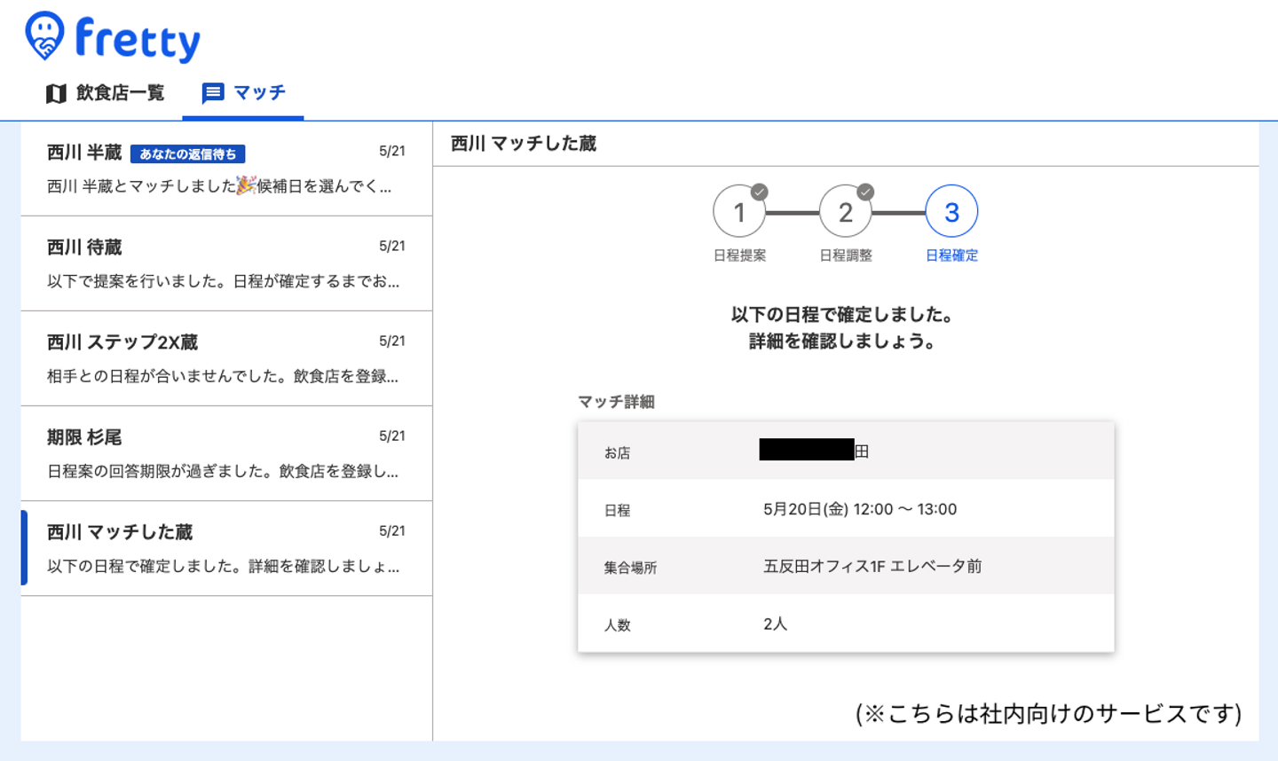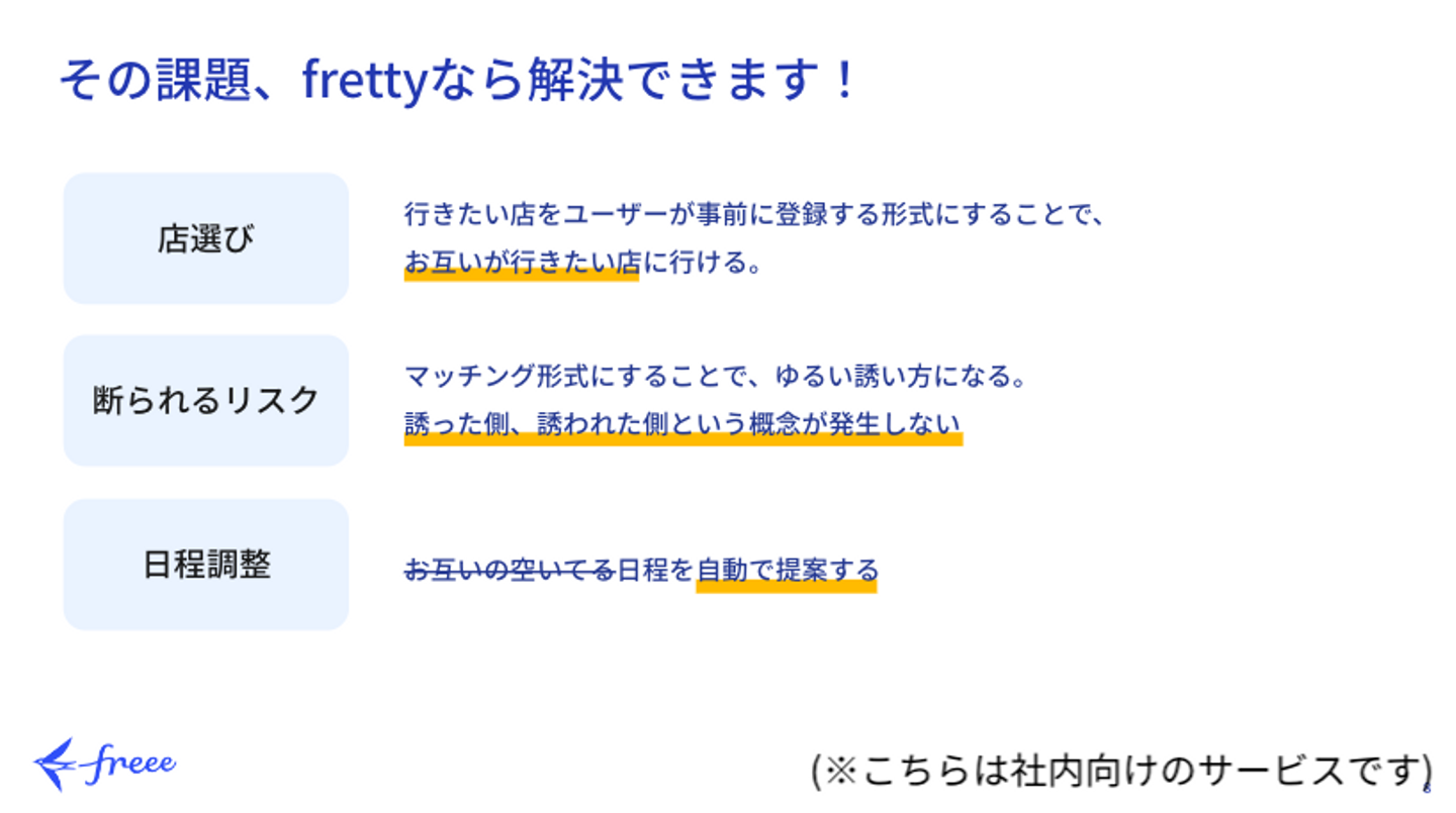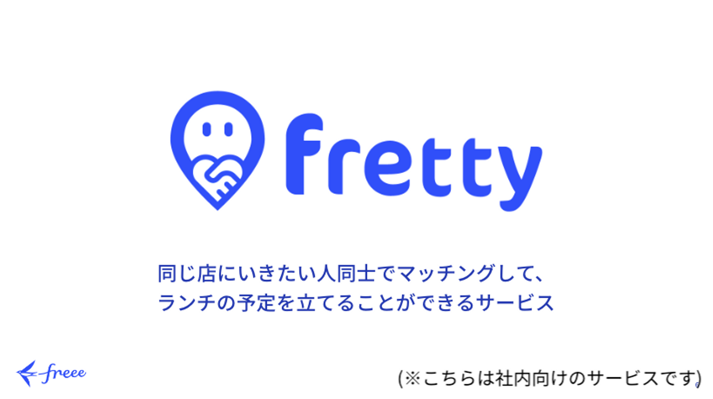 私たちのチームでは、同じ店に行きたい人同士でランチに行けるサービス『fretty』を開発しました。 アンケートやユーザーインタビューから、ランチや飲み会の予定があると出社のモチベーションが高まることがわかりました。そこで職場で安心して話せる相手を増やすために、あまり接点がなかった人ともランチに行けるサービスを作ることを目標にしました。 ランチを誘うときの課題であると考えた、断られるリスク、日程調整・店選びの大変さを軽減するために、同じ店に行きたい人同士のマッチングアプリという形式にすることになりました。 とはいっても、最初からロジカルに作るものを決められたわけではなく、アンケートやインタビューの結果を整理するワークショップを行っては悩みを繰り返し、最終的にチームのメンバーのひとりが一番やりたいと思ったテーマを突き詰めることになりました。