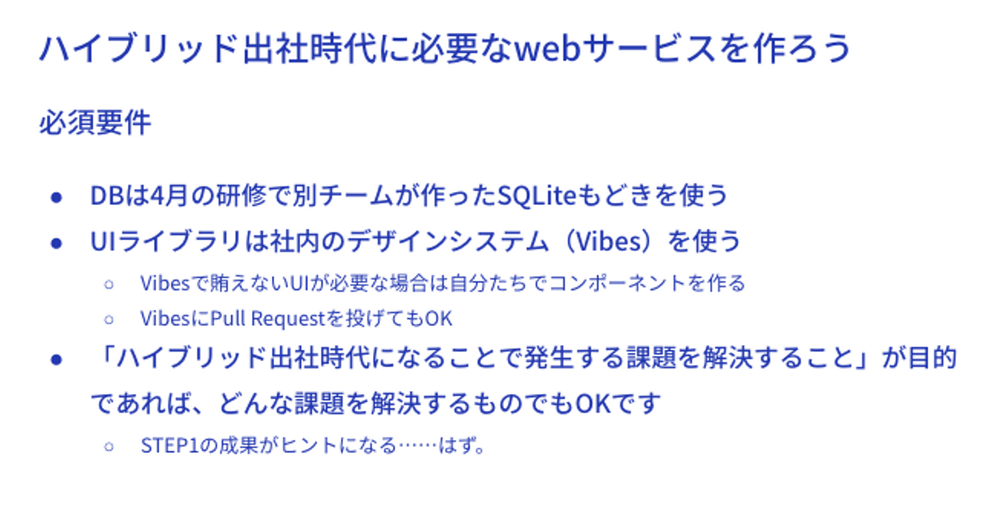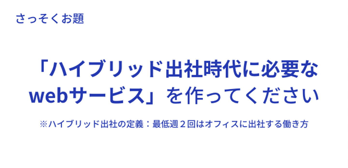 hamilton「今年のテーマは、『ハイブリッド出社時代に必要なwebサービス』です。それぞれのチームが企画からデザイン、設計、実装までを一貫して行いました」 hamilton「研修当時(2022年4-6月)はfreee社内でもまだまだリモートが主流だったので、ハイブリッド出社にシフトした結果、どんな問題が起きるのか、どんなシステムがあれば嬉しいのかは誰もわからない状態でした。これはfreeeでの実際の業務とまさに同じで、解決するべき、正解のわからない難しい課題です。 どんなことが起きるのかの仮説を立てたり、ユーザーとなるfreee社員のリサーチをしたりしながら、チームで課題を見つけるところから取り組んでもらいました」 細かい条件は以下のもの。