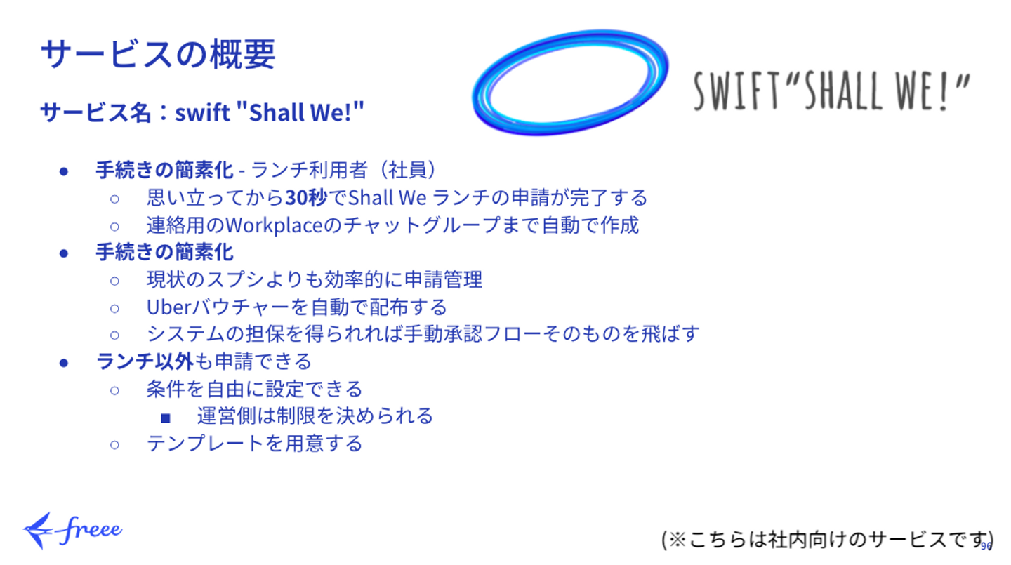 社内コミュニケーション&ランチ費補助制度である「Shall We ランチ?」を改善するサービスとして、「Swift Shall We」というものを開発しました。 既存の「Shall We ランチ?」の管理は全てスプレッドシートで行われており、運営側の管理がハード、申請側もどのように制度を利用できるのか理解していない人がいる、という2つの課題がありました。 そこで「Shall We ランチ?」を開催するハードルを下げることで、リモート環境である現状でも社内の交流を維持できるのではないかと考えました。 ー苦労した点と、工夫したポイントを教えてください!