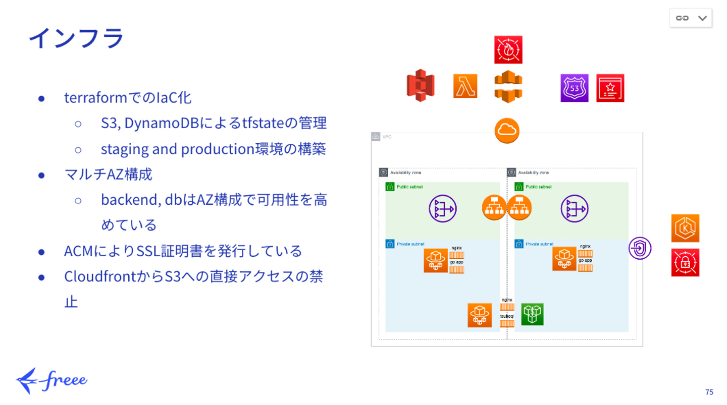 新規でマイクロサービスを立ち上げることになった場合にやらなければいけないことを一通り体験した研修でした。 チーム内のメンバーがそれぞれ新しい言語・技術に触れることができる良い機会になったと思います。 特に私のチームでは、インフラ経験者が誰もいなかったので自分が率先してインフラ担当になりました。技術スタックを社内でよく使われているものに寄せることで、その後の実務に役立っています。 freeeでは約2ヶ月間をかけてこのような研修を行い、研修の成果に基づいて配属が決定されます。
