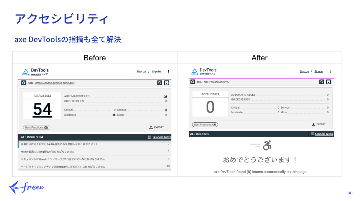 苦労したのは、一度テーマが変わったことでした。 実は、初めは「会議室が空いていない」ことに対する声が一番多かったので、全員オンライン参加の会議の場合は、会議室の予約を自動で削除して会議室不足を解消するサービスを考えていました。しかしPSIRTやCSIRTに相談した結果、「そこまで強い権限を使うことは難しい」との返答をもらい断念しました。 この時点で開発研修期間の半分が終わっていました。残りの時間で再度案を練り直して、ユーザーインタビューを行い、チーム一丸となって方向転換しました。 工夫したのは、出社予測の人数はCSIRTの指摘通りに匿名化処理したカードログデータを使って、機械学習で予測するようにしたことです。 さらに精度を上げるために、天気のデータなどをAPIで引っ張ってきて、それを予測に使っています。突発的なイベントには弱いですが、そこそこの精度で各階の出社人数を予測できるようになりました。 またACDASのWebアプリはページ遷移もないため、非常にシンプルな画面となっています。これ以上画面を増やしても利便性が向上するわけでもなかったので、研修で学んだことを活かしてアクセシビリティを最大限まで高めました。 具体的にはAxe DevToolsで指摘されている問題点を全て解消し、またスクリーンリーダーで適切に読み上げられるように修正しました。前半の座学で学んだことで解決できない疑問点については、定期的に社内で開催されている「アクセシビリティー相談会」と「UXアワー」で相談しました。freeeの掲げる「誰でも使うことのできるプロダクト」に近いものができたと思います。またエンジニアが使いやすいようにslack連携も実装しました。 ー開発研修に参加して全体的にどうだったか、やりがい、雑感などを教えてください