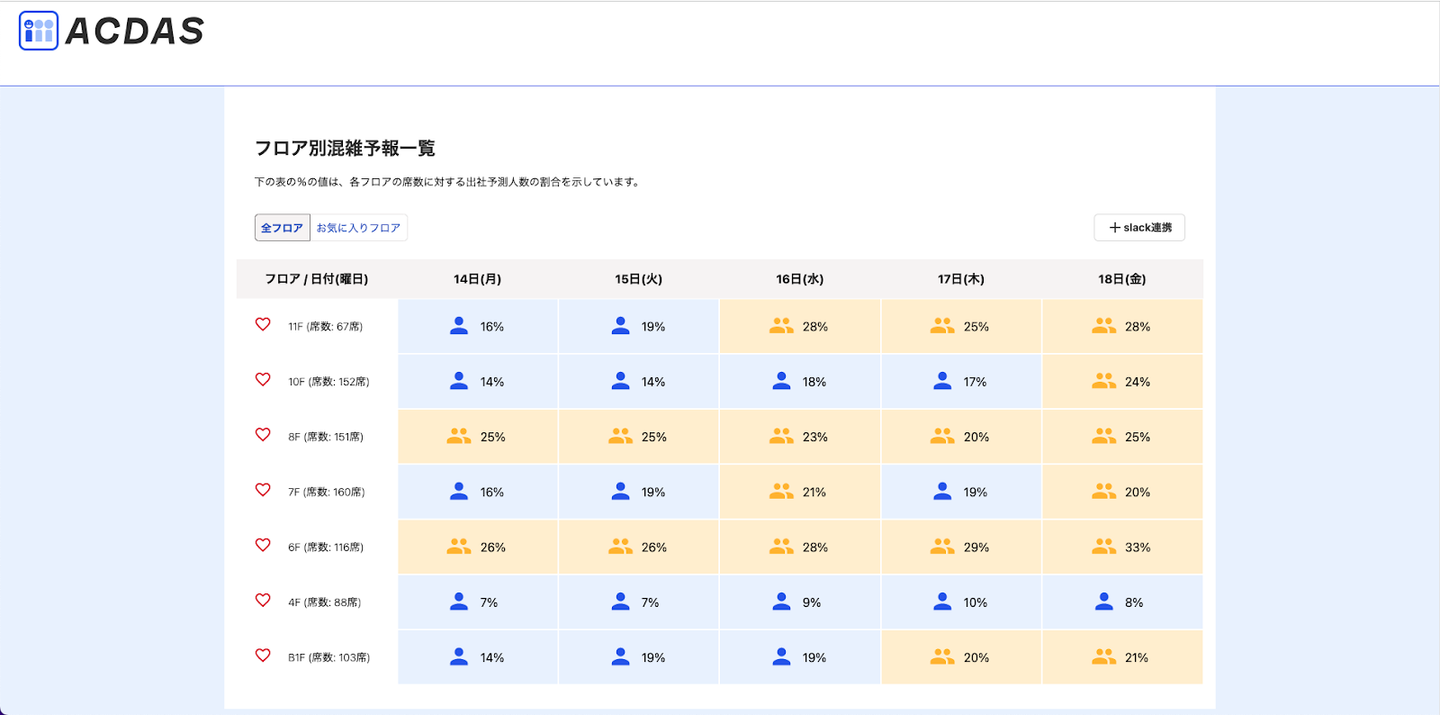 ACDAS(Automated Crowd Data Acquisition System:混雑データ自動収集システム)というサービスを作りました。これは1週間先の、オフィスの階ごとの出社人数を予測して提供するものです。 作ることになった背景としては、freeeメンバーに「ハイブリッド出社に感じている課題感」についてアンケートをとったところ、人が多い時に出社したくないと感じている人が一定数いることが分かったからです。 ー苦労した点と、工夫したポイントを教えてください!