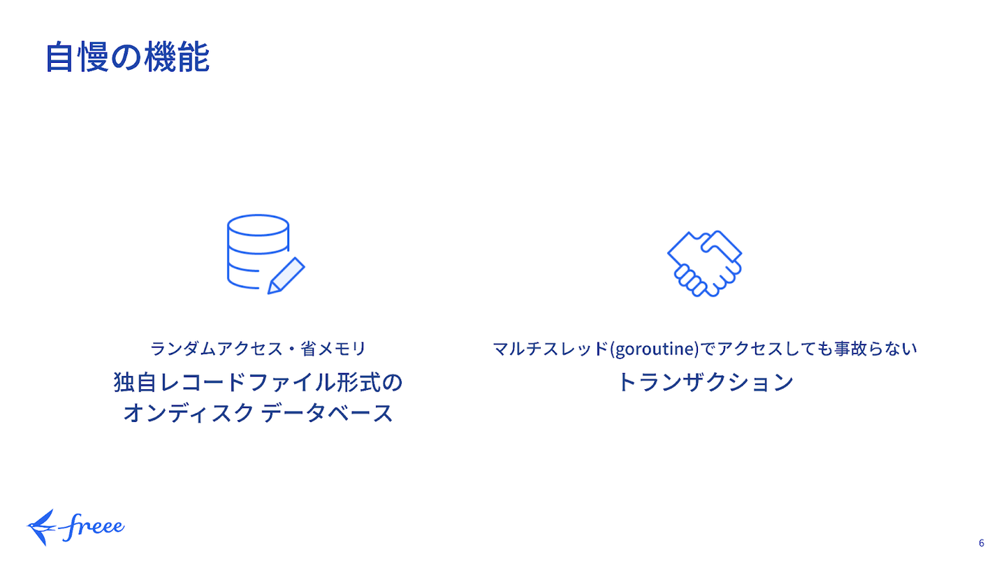 hamilton「今年は『 チームでDBMSを作る 』というテーマでやってもらいました。 ジュニアなアプリケーションエンジニアはミドルウェアやOSSをブラックボックスとして開発をしてしまうことが多いですが、ちゃんと中身を理解して使うことはとても重要です。特にfreeeの開発においてはトラフィックも多く、パフォーマンスなど色々と考慮しないといけないことも多いので、しっかりとミドルウェアやOSSの中身を理解する必要があります。 今回はfreeeの中でも特にパフォーマンス観点でボトルネックになりやすいDBについての知識を深めてもらうために、DBMSを作るというテーマを採用しました。 最終的には中間発表で基盤開発の成果を発表してもらい、研修後半の製品開発では、完成したDBMSを実際に別のチームが使用して製品を開発します」 【基盤開発研修の感想】 azyo 私のチームでは、Go言語用のライブラリとしてDBMSを作成しました。独自のファイル形式を設計したり、トランザクション機能を実装したりしました。 技術選定は、製品開発でこのDBMSを利用する班が使えそうな言語をヒアリングした上で行いました。機能については、SQLiteやPostgreSQLの機能や実装方法を参考にして、「これくらいのことができたらWebサービスのためのDBMSとして使える」という観点で設計を行いました。 私個人としてはプロジェクトマネージャー的な動きに挑戦しました。設計では詳細設計をメンバーに割り振り、開発ではタスクを洗い出してJIRAを整備しました。設計で全体の構成が決まっていたので、当初はコンポーネントごとにバラバラに開発して、最後に合わせようと考えていましたが、メンターからアドバイスをいただき、「〇〇ができる」という小さなマイルストーンを置きながら進めるように方針を転換しました。 このようにアジャイル的に進めることで、スケジュールが危うくなったときに諦める機能の選択がしやすくなりました。
