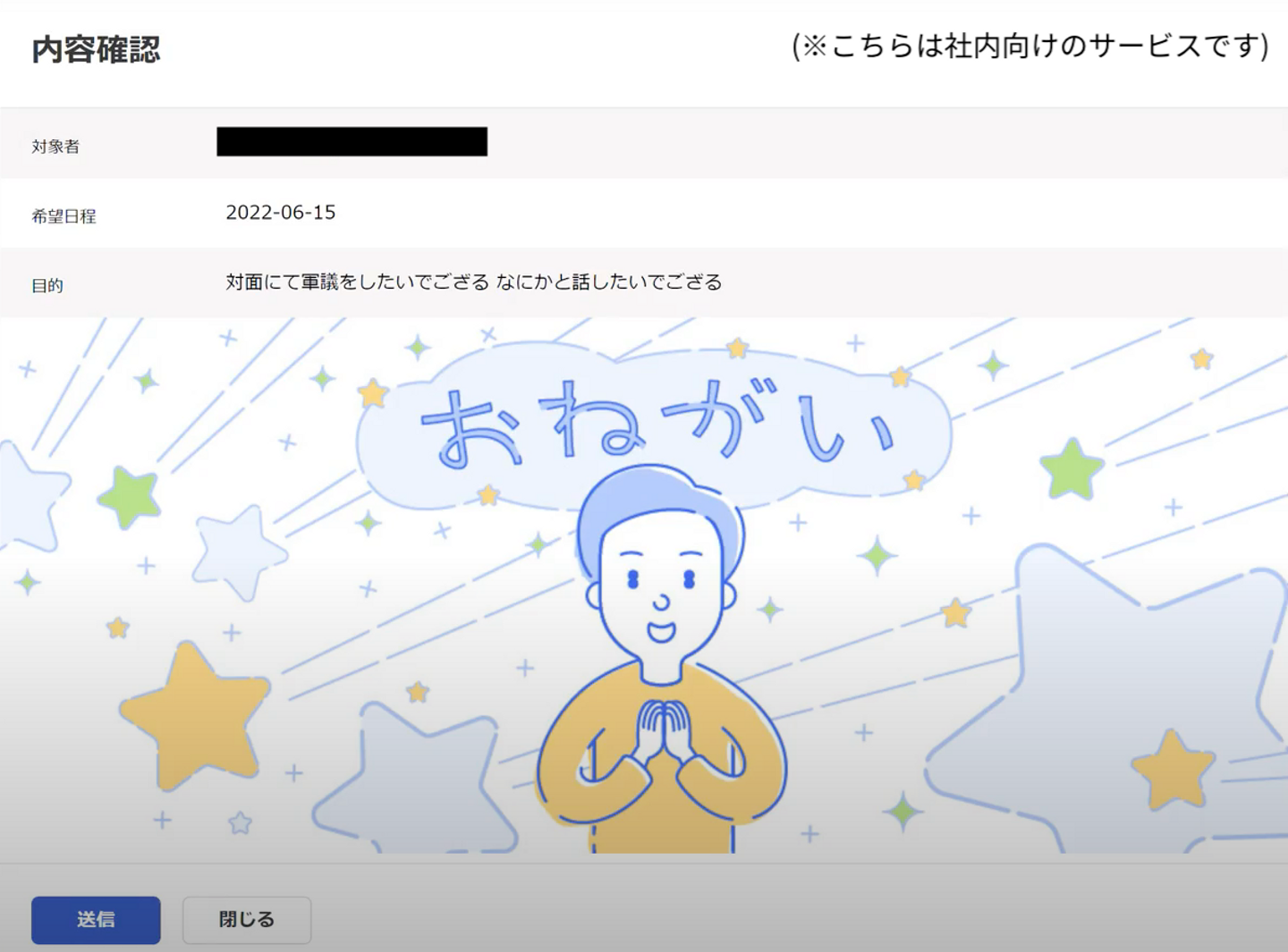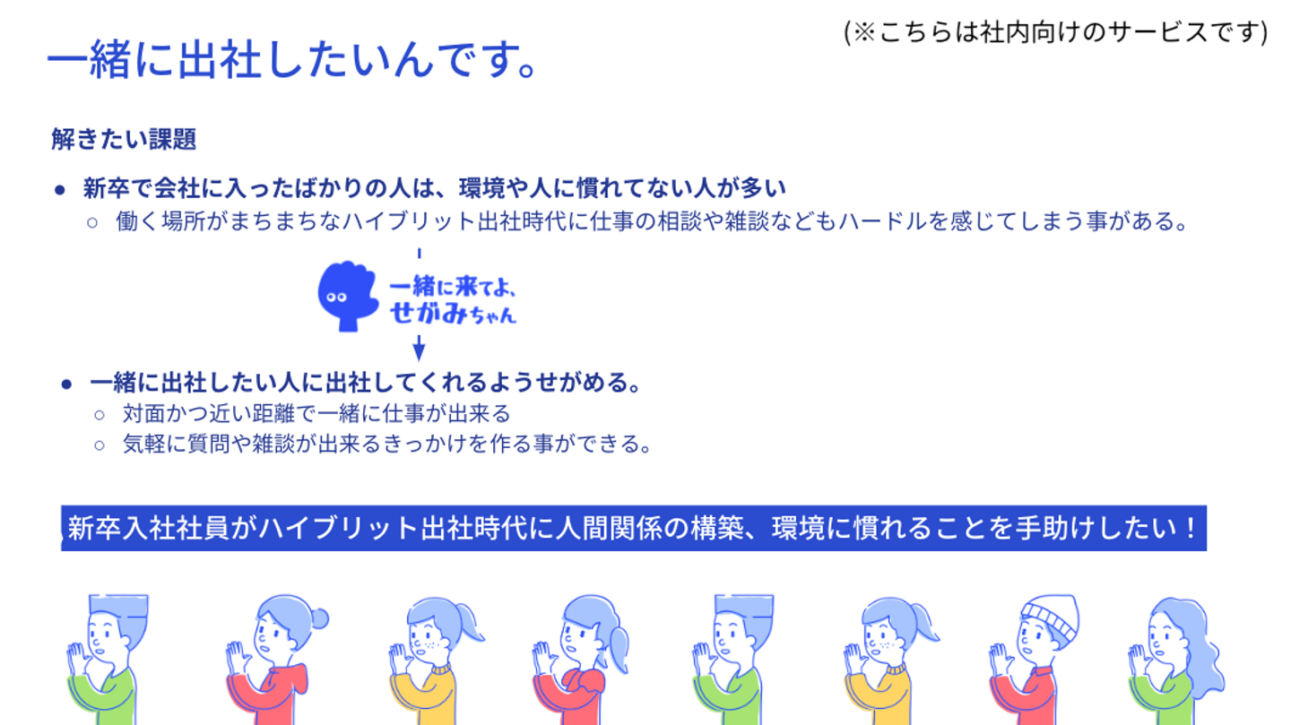 私のチームでは、気軽に出社を誘えるアプリ『一緒に来てよ、せがみちゃん』を開発しました。 新入社員にとってSlackなどでのコミニケーションには限界があり、気軽に質問や雑談が出来るきっかけを作る環境が必要だと考えました。そのためには、対面かつ近い距離で一緒に仕事が出来るように一緒に出社することが一番良いと考え、一緒に出社したい人に出社をせがめるサービスを開発しました。 ー苦労した点と、工夫したポイントを教えてください!
