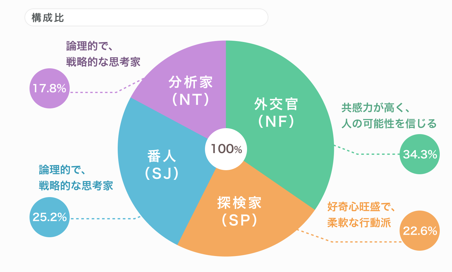 次に、16タイプを4グループに分けて構成比を見てみましょう。 結果は、「外交官(NF)」タイプが全体の約4割を占め、最大の勢力であることが判明しました!