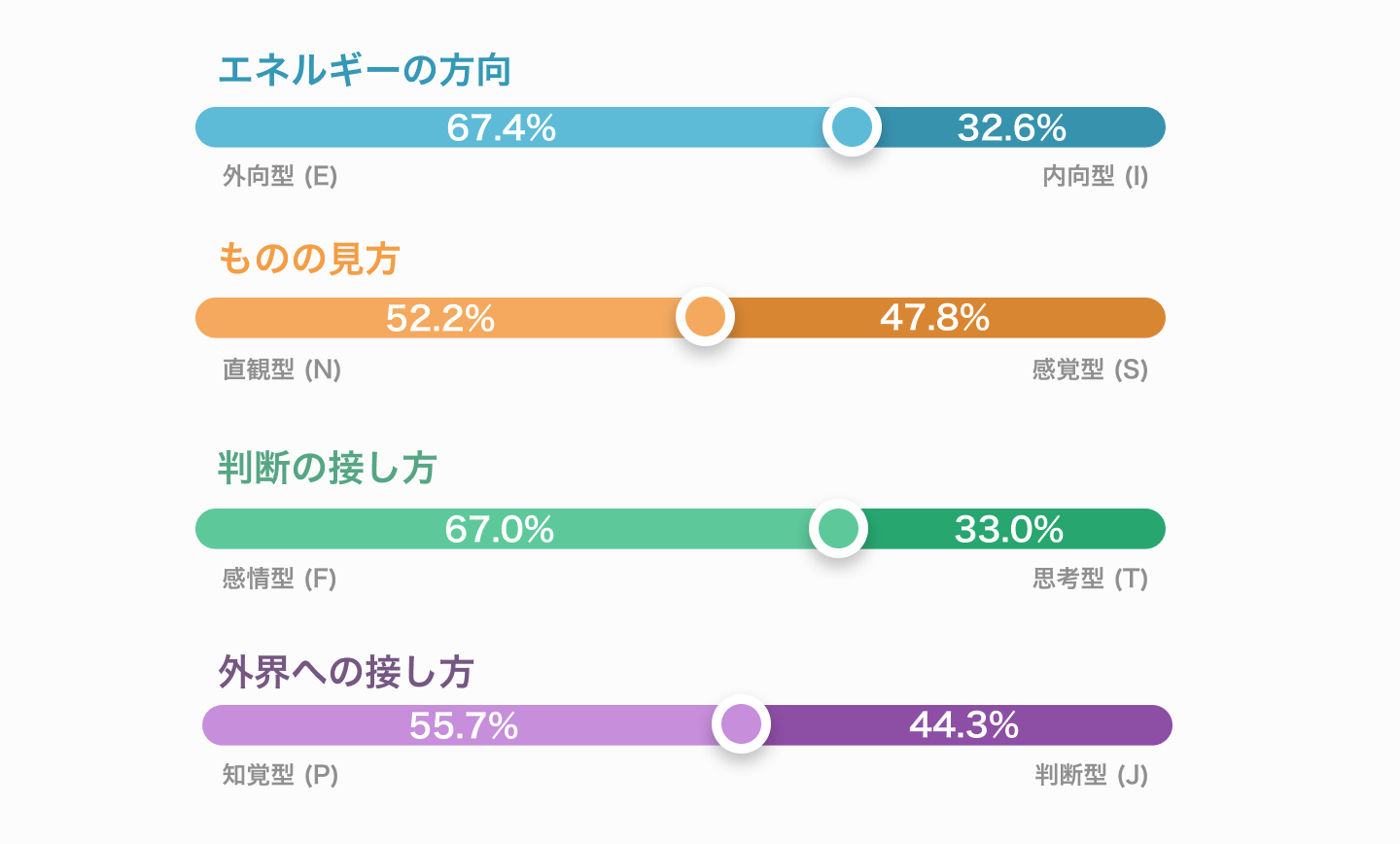 - 【F:74% vs T:26%】 約4分の3が、人の気持ちや調和を大切にする感情型(F)!