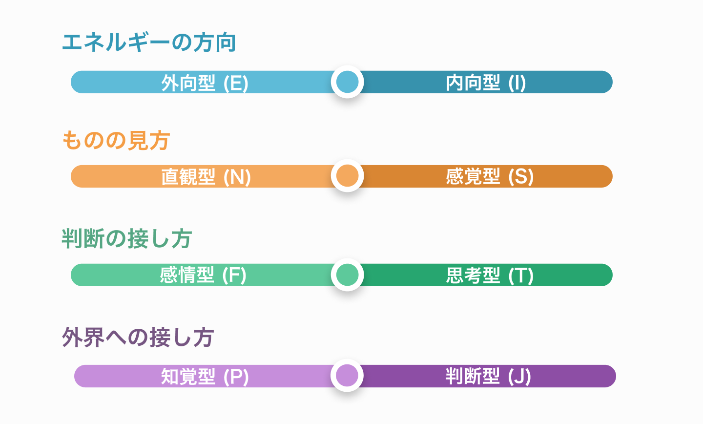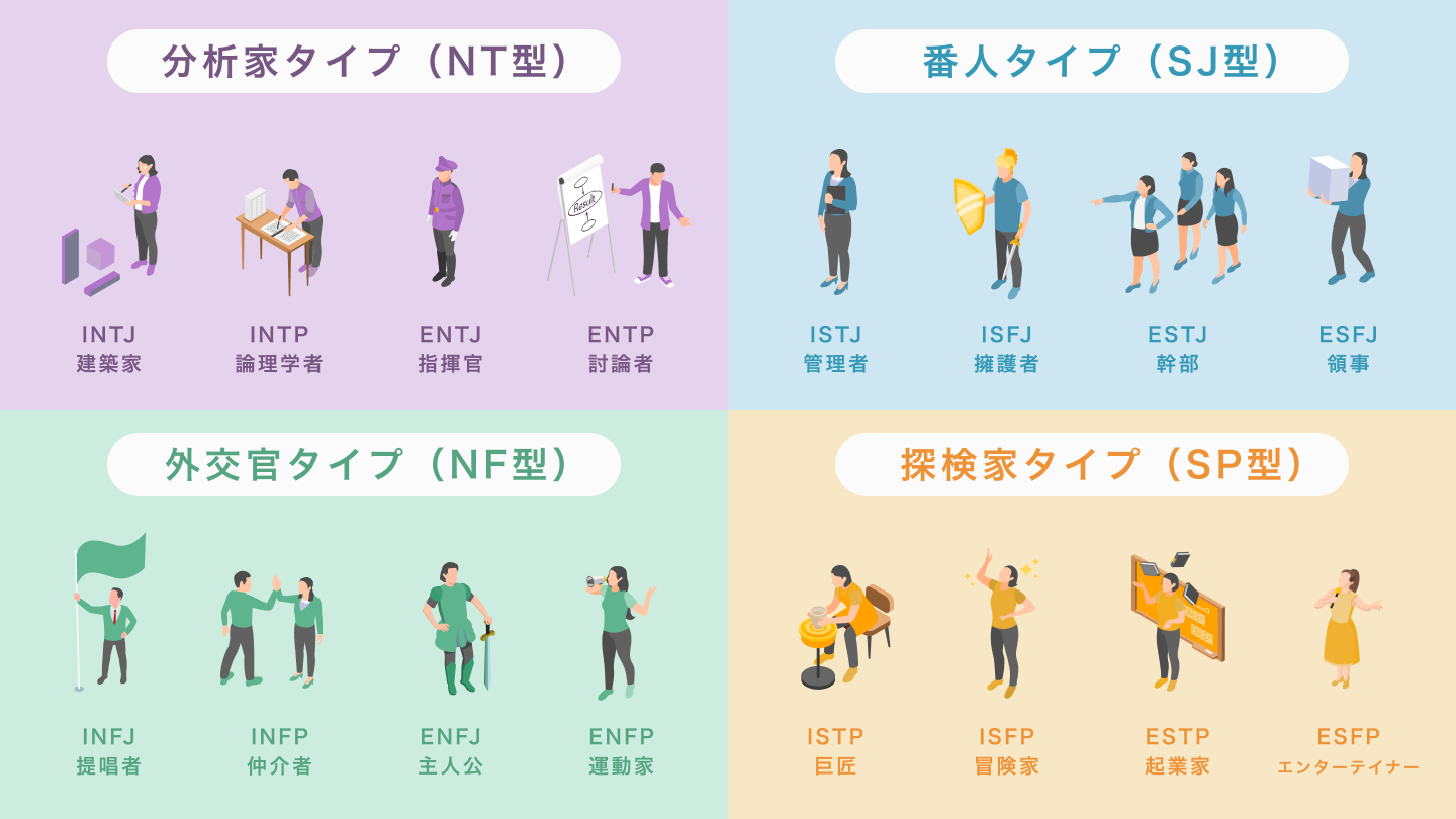 ご存知の方も多いと思いますが、MBTIは人の興味関心やものの見方などから、性格を16タイプに分類する診断ツールです。4つの指標を組み合わせることで、個人の思考や行動のクセ、強みなどを理解する手がかりになります。