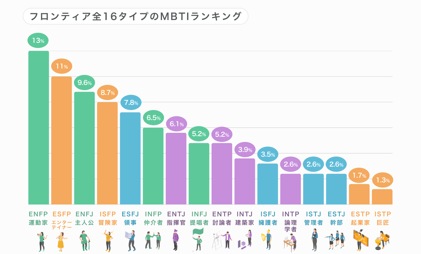 一方で、誠実で献身的な「ISFJ(擁護者)」や、協調性がある「INFP(仲介者)」、論理的で戦略家の「INTJ(建築家)」なども多数在籍しており、組織の多様性を感じさせます。このランキング全体が、フロンティアという組織をそのまま表しているのかもしれません!