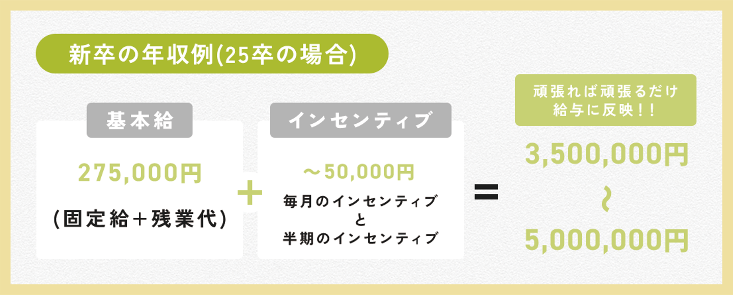 インセンティブの条件達成率は社員の半数以上となっており、新卒でもインセンティブを含めると年収400万円以上が可能です。